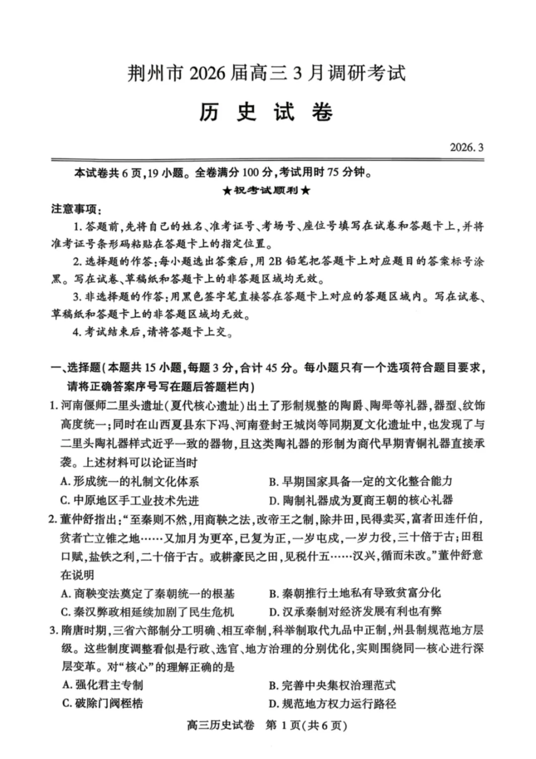 当前位置:首页>考研真题>【历史试卷-湖北省荆州市2026届高三3月调研考试