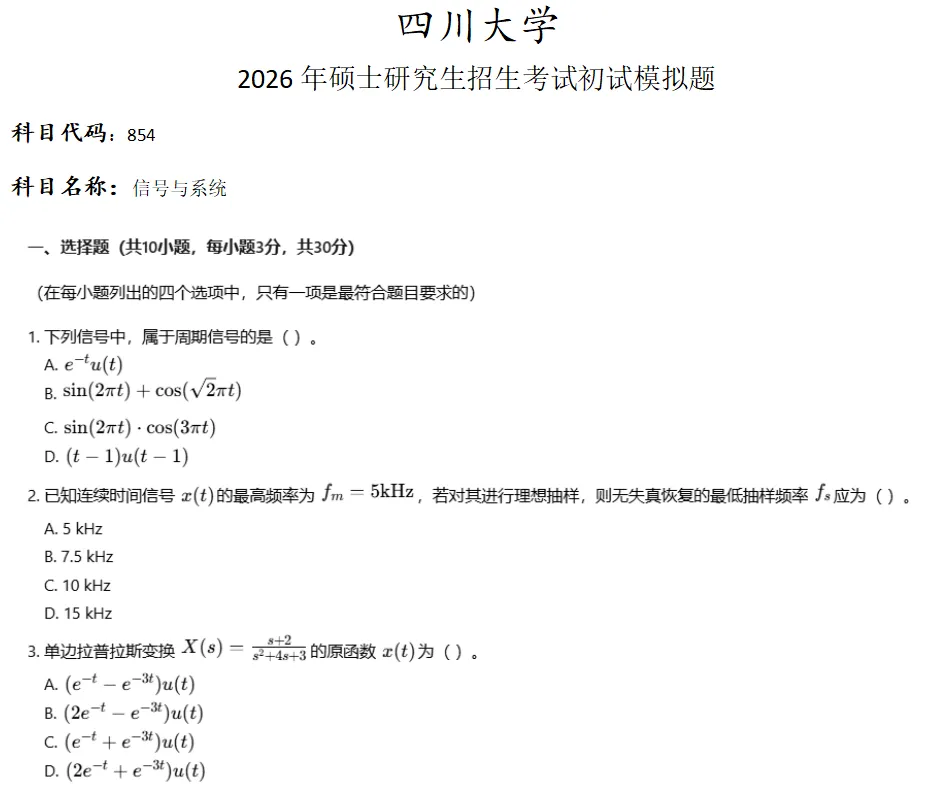 >四川大学854信号与系统考研真题模拟
