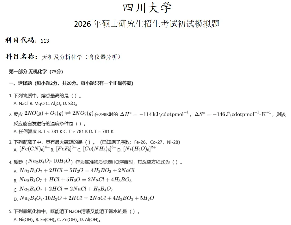 >四川大学613无机及分析化学考研真题模拟