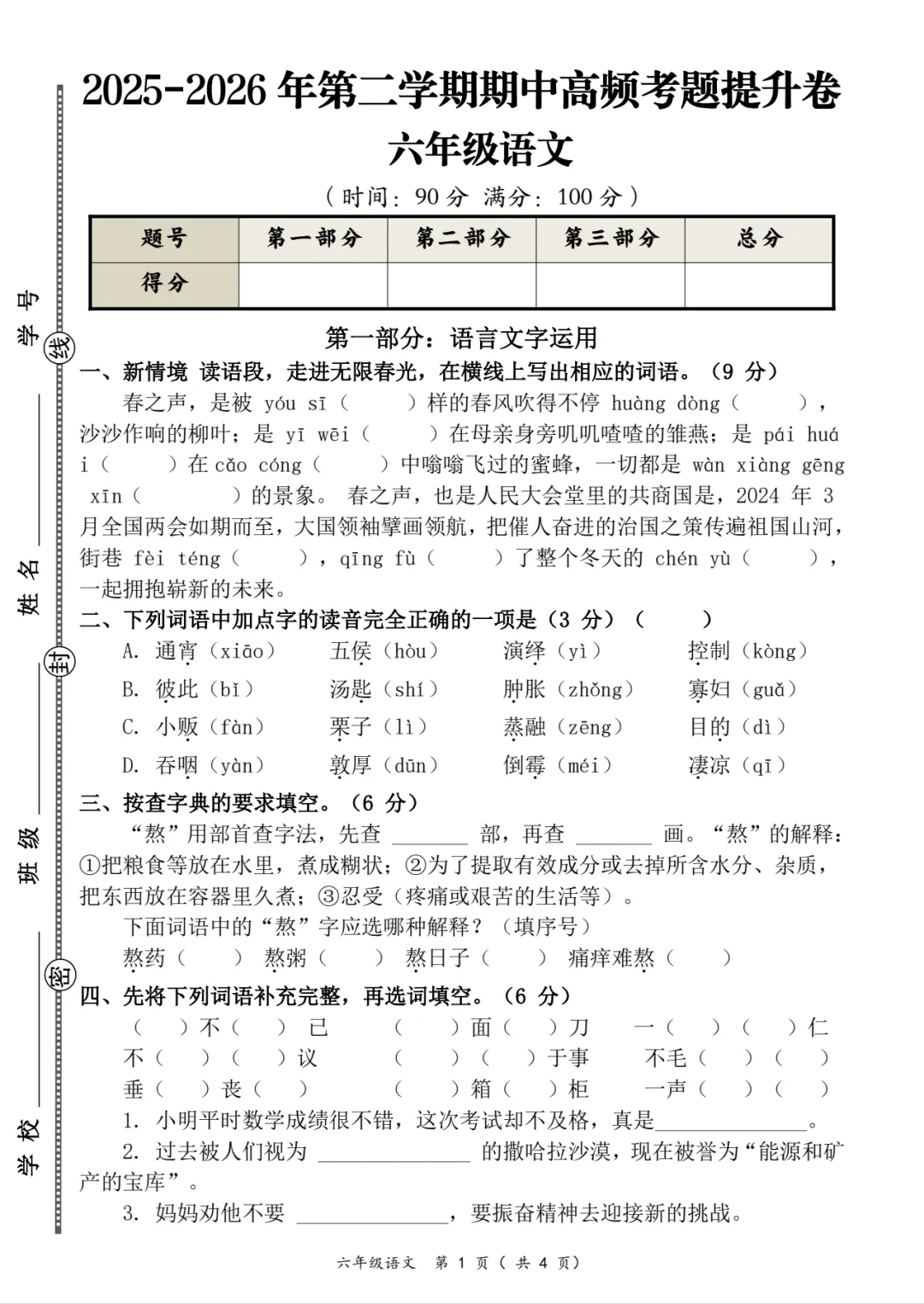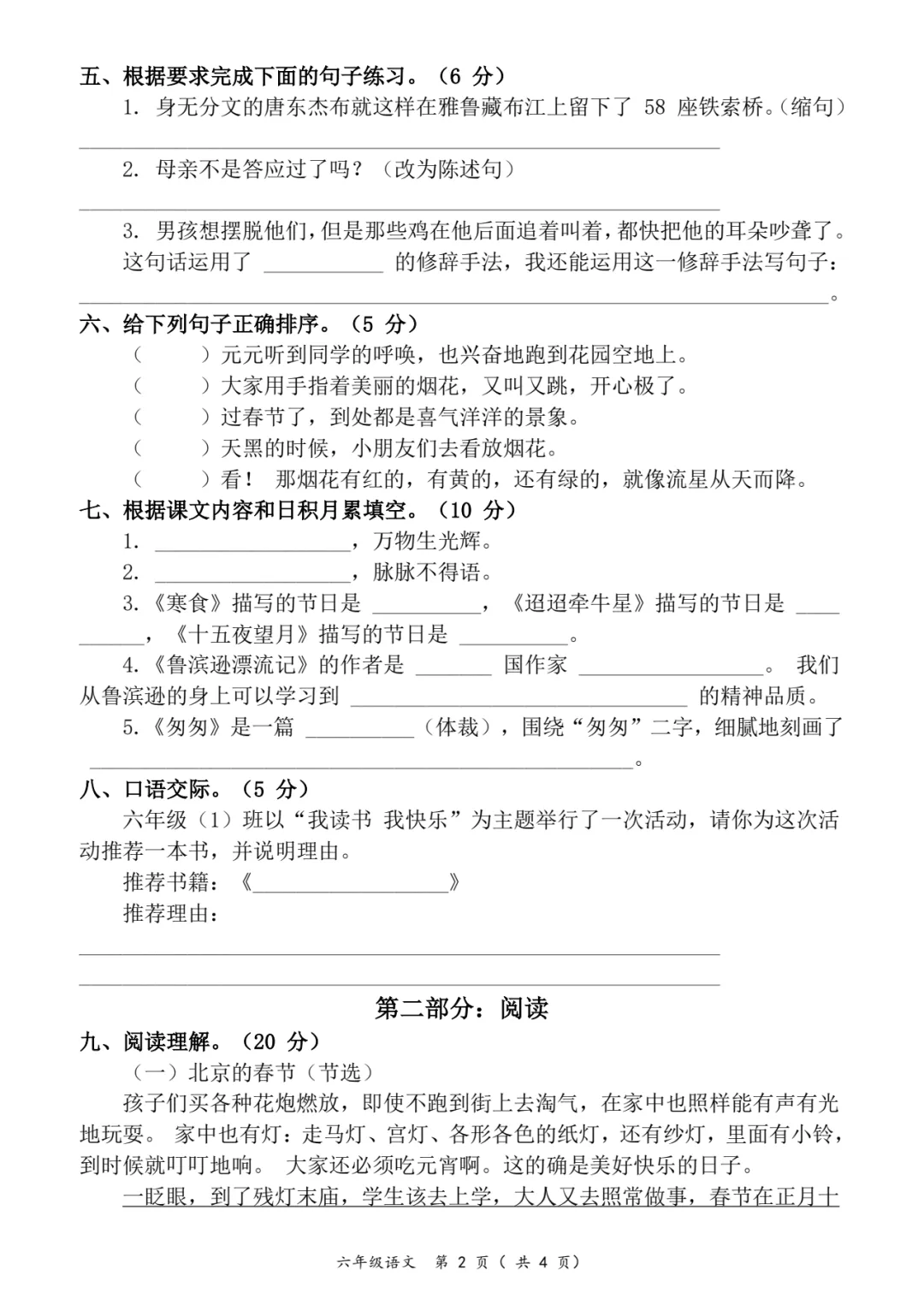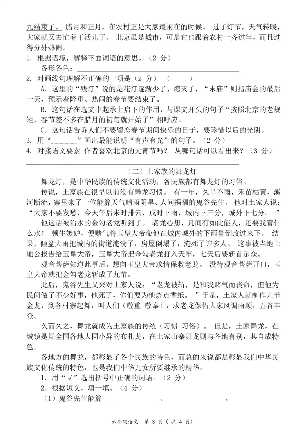 六年级下册语文第一次月考质量检测卷(一、二单元)