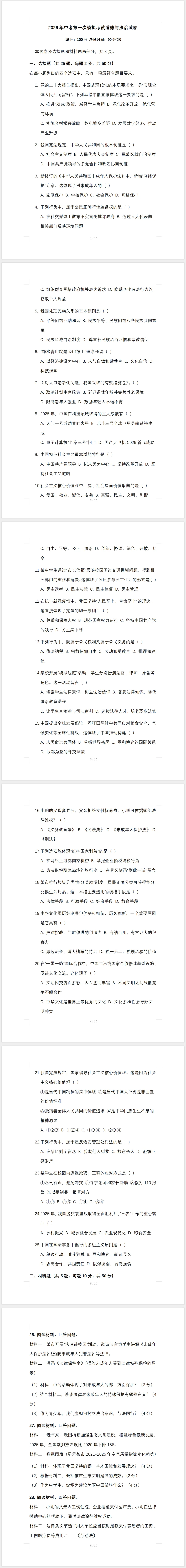 >2026年中考第一次模拟考试道德与法治试卷及答案