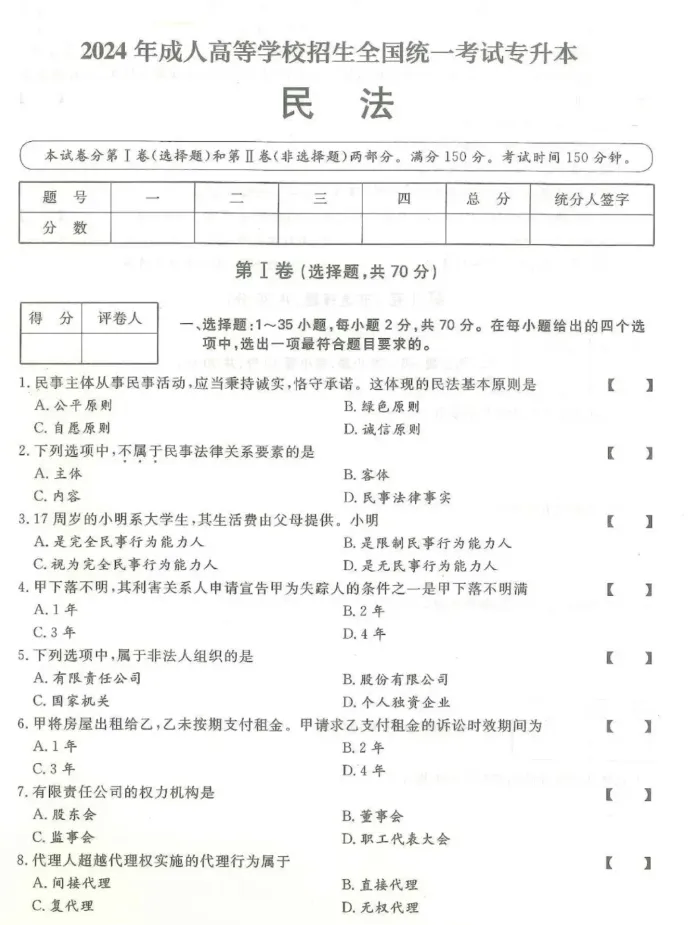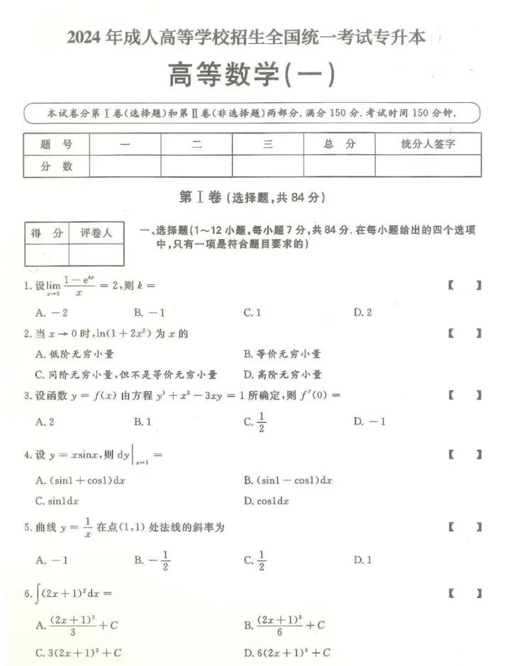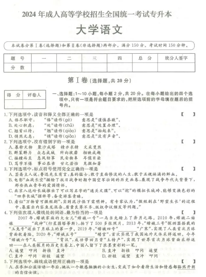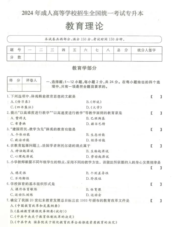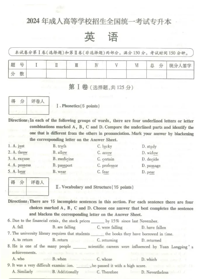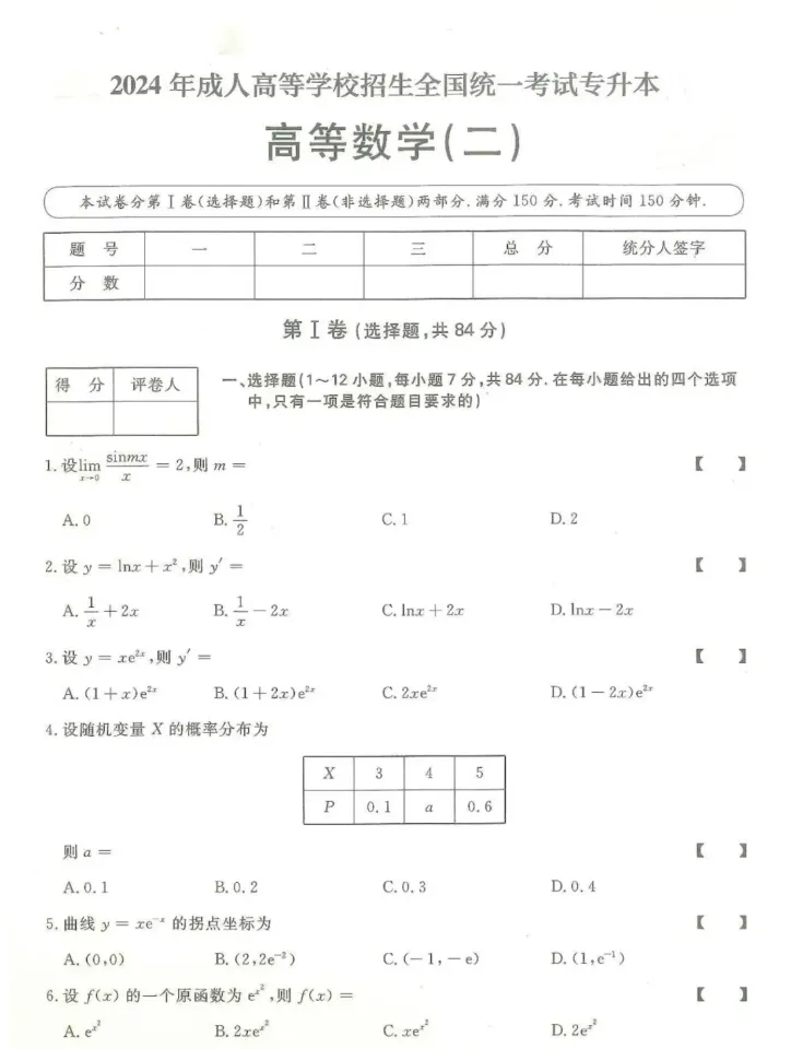 >2024年成人高考(专升本)入学考试真题试卷+答案解析!