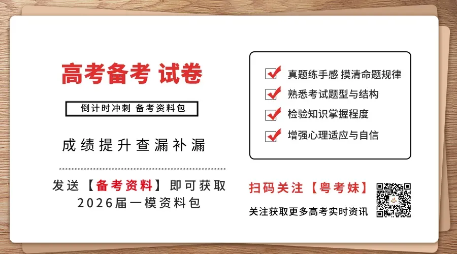 关注“粤考妹”公众号,回复关键词:”高考真题“,领取往届广东高考真题,”一模“可以获取一模试卷及答案。