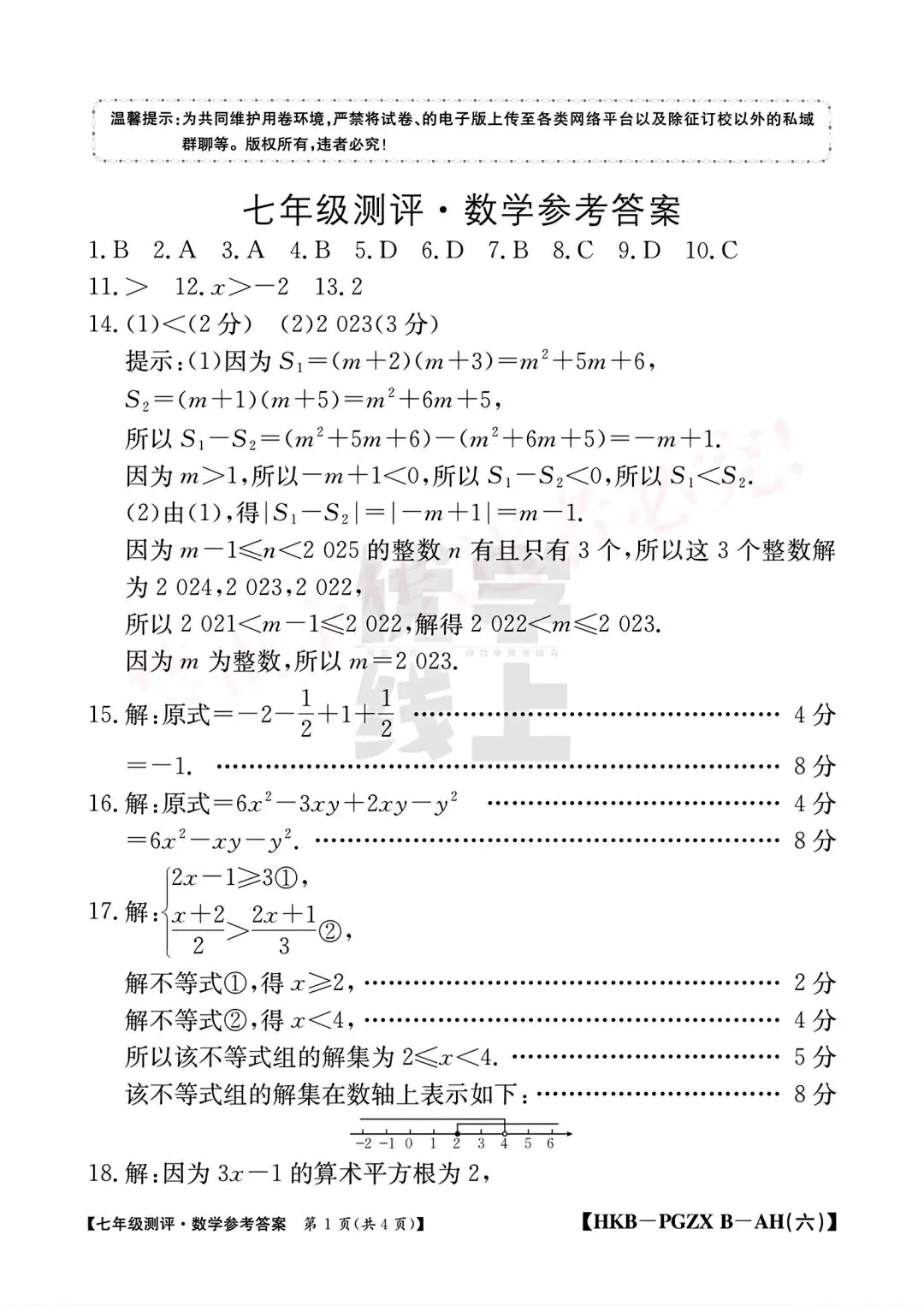 2026年七年级测评数学试卷(期中)和答案(下册6.1-8.3)