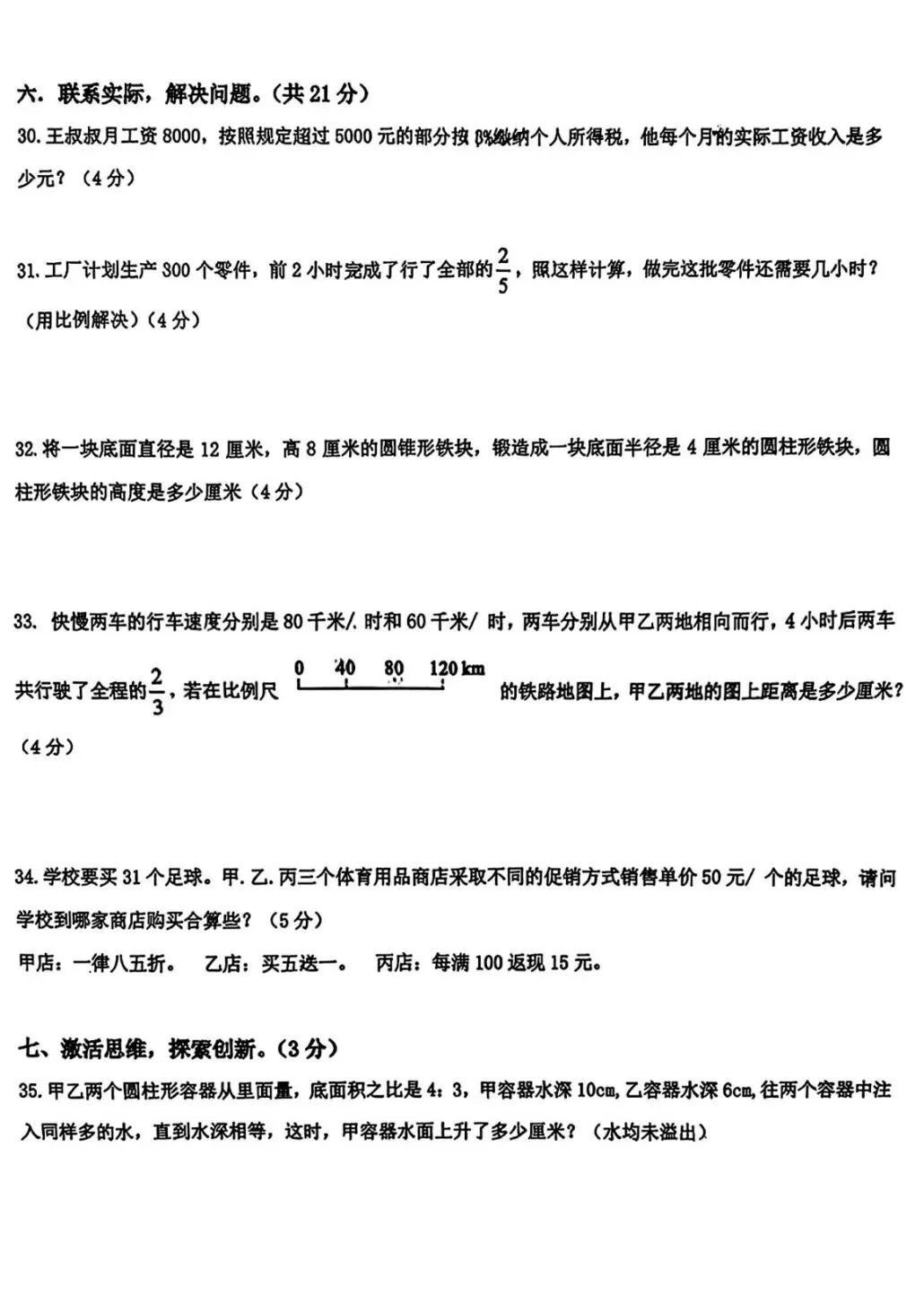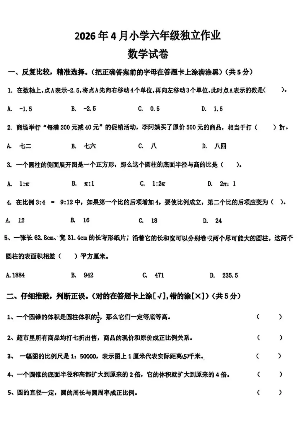 2026年七年级测评数学试卷(期中)和答案(下册6.1-8.3)