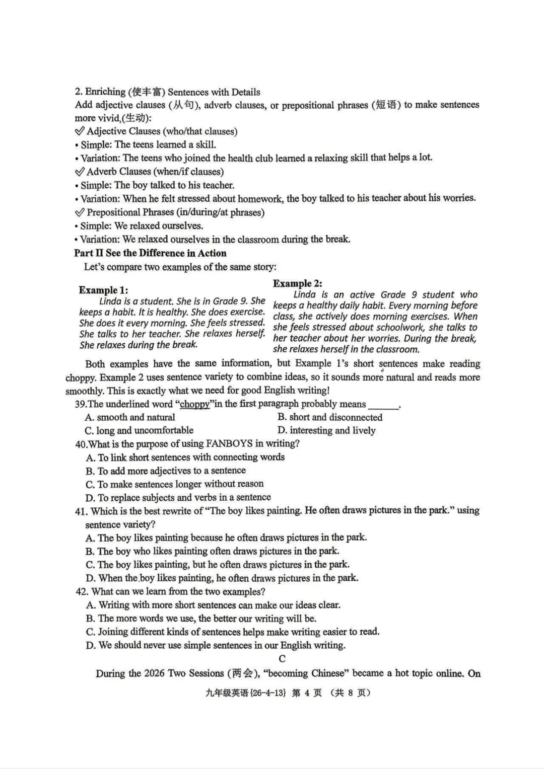 最新!2026上海黄浦区初三二模语文试卷及解析出炉!