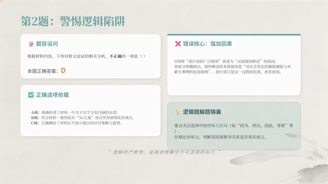 2D(强加因果。原文是:“正是对社会变化的敏锐捕捉与对新生事物的包容接纳,让汉语始终保持鲜活。”)