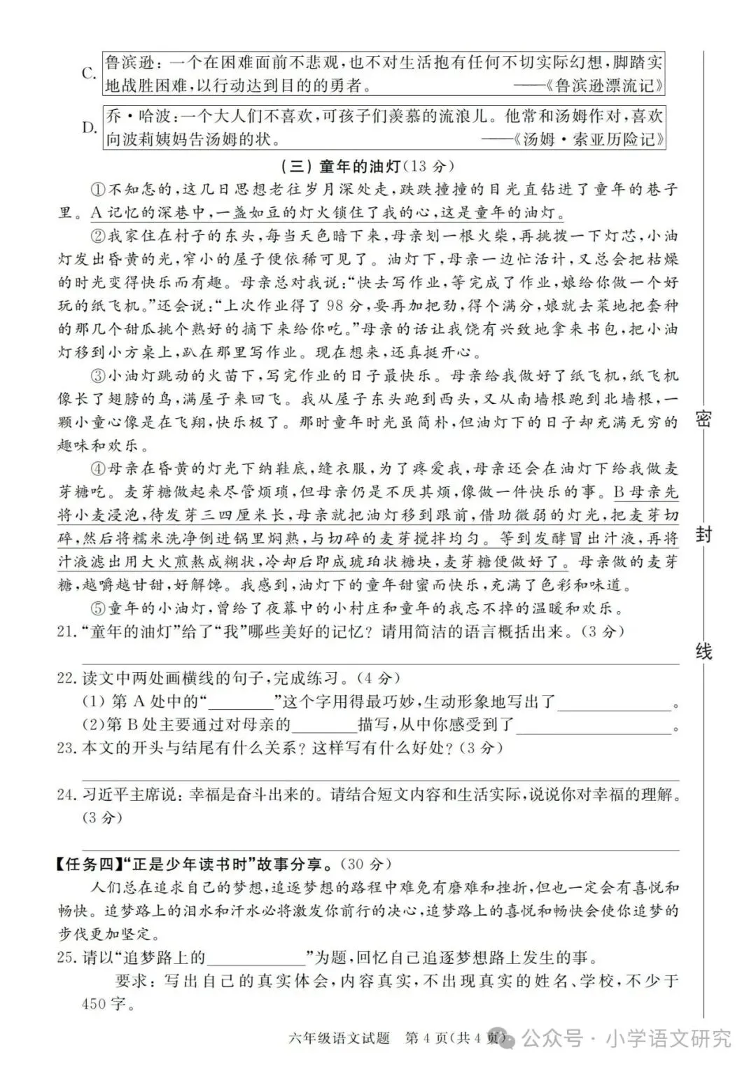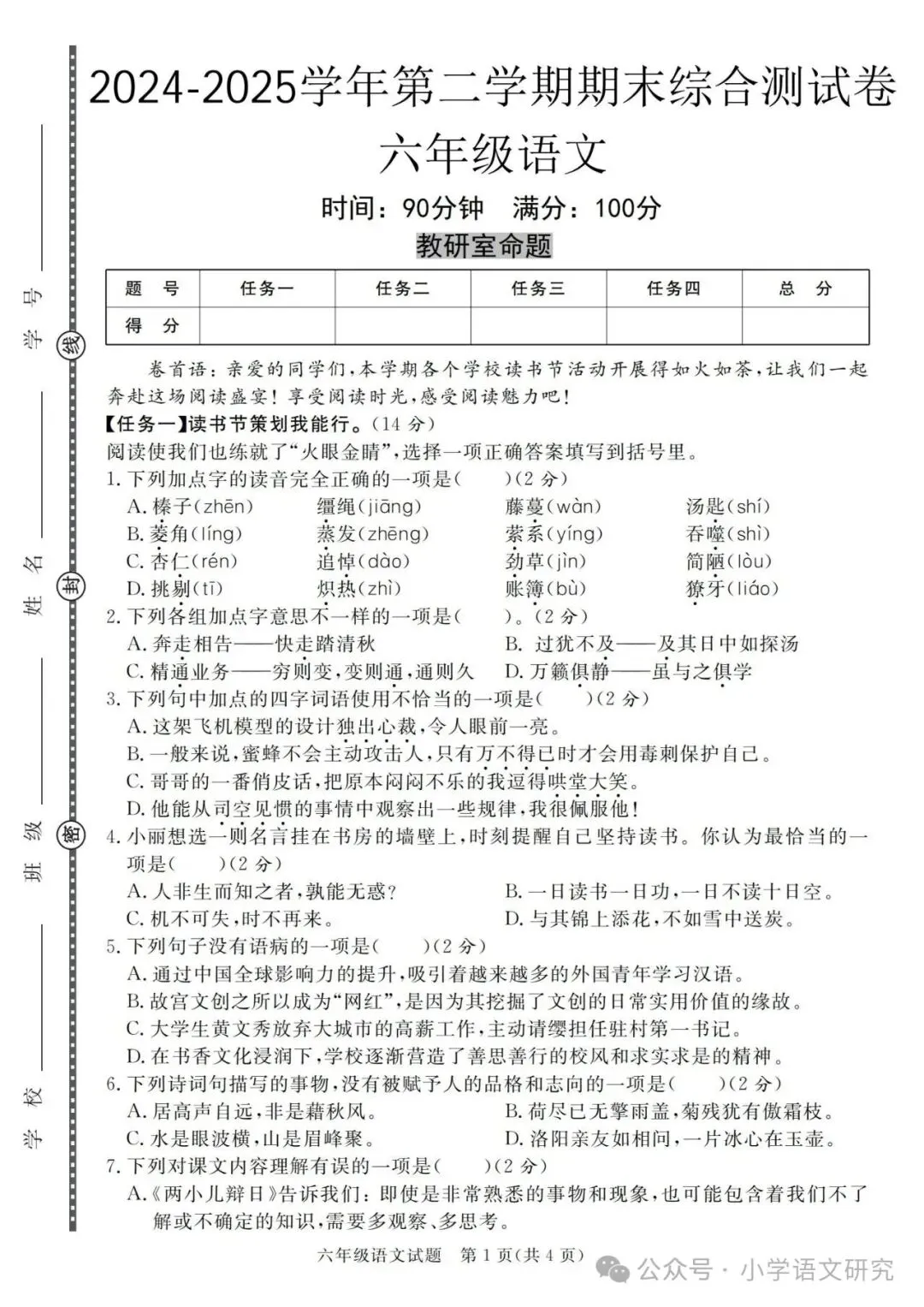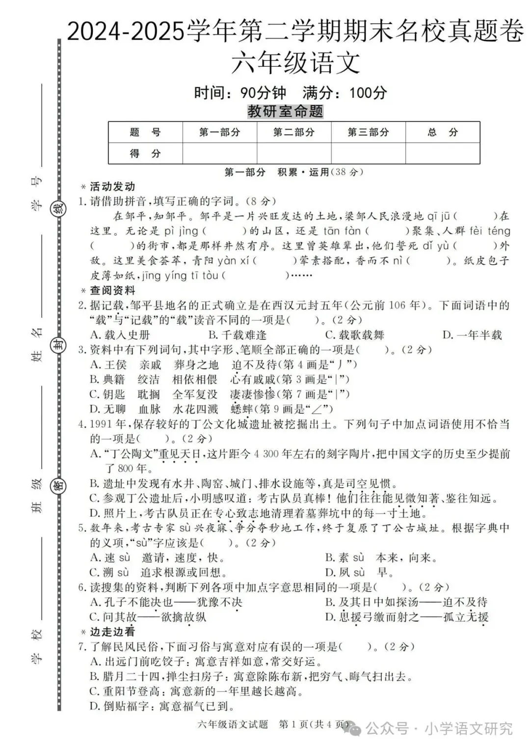 >六年级语文《小升初模拟试卷7套》含答案丨可下载