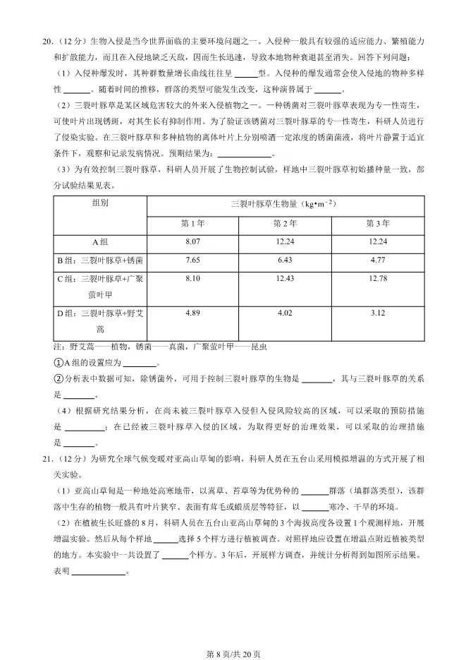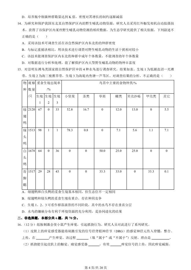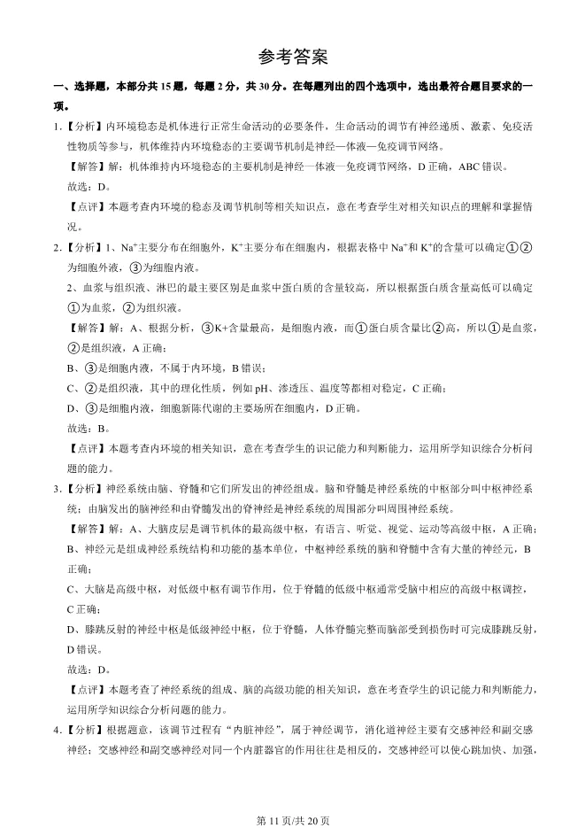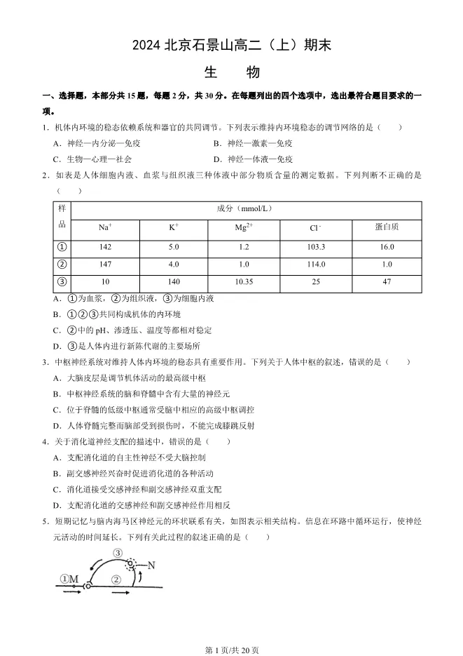 2024北京石景山高二上册期末生物试卷(有答案) 电子版试卷获取,后台回复:试卷