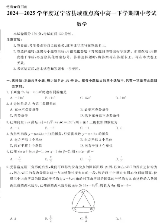 【高一】期中丨往期试卷-辽宁省县域重点高中2024-2025学年高一下学期期中