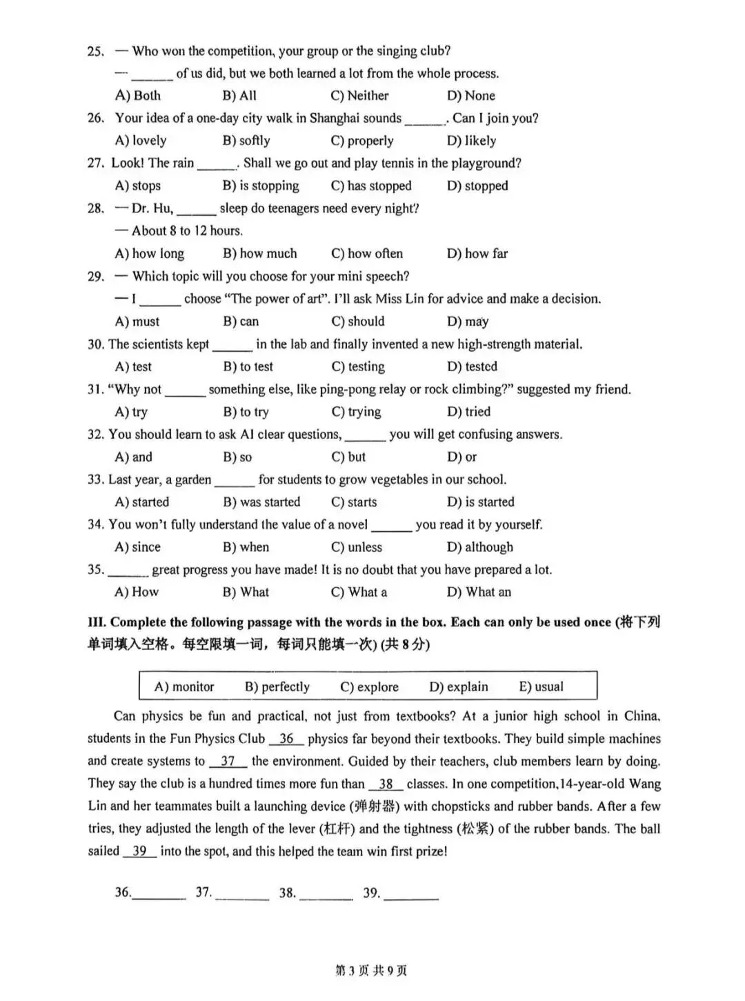>2026届上海市嘉定区初三二模英语试卷(含答案)