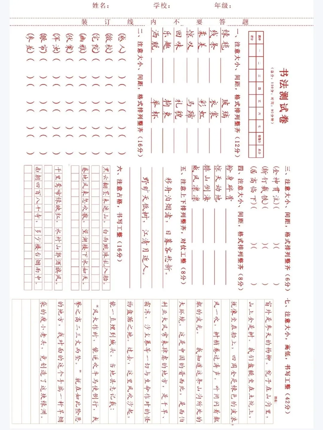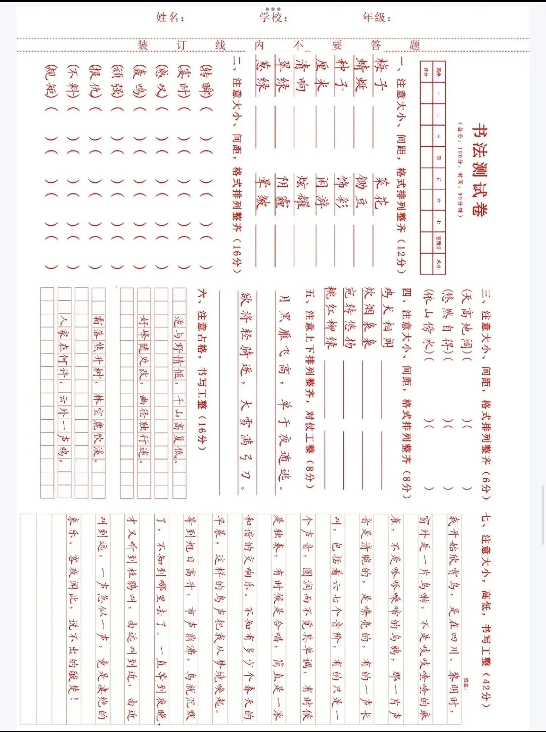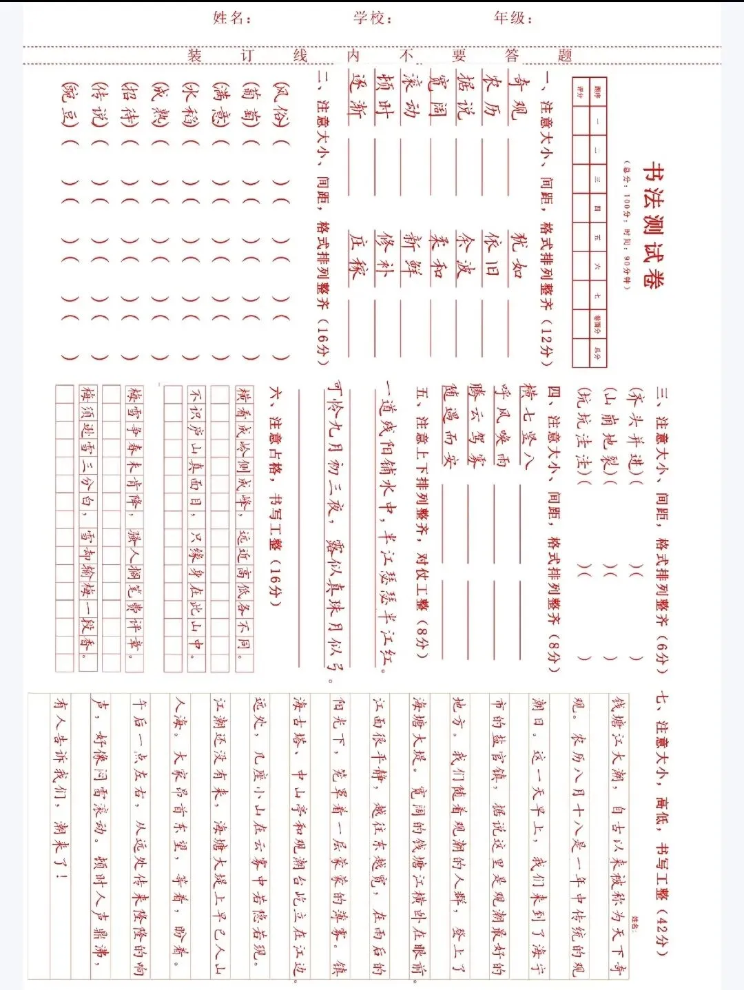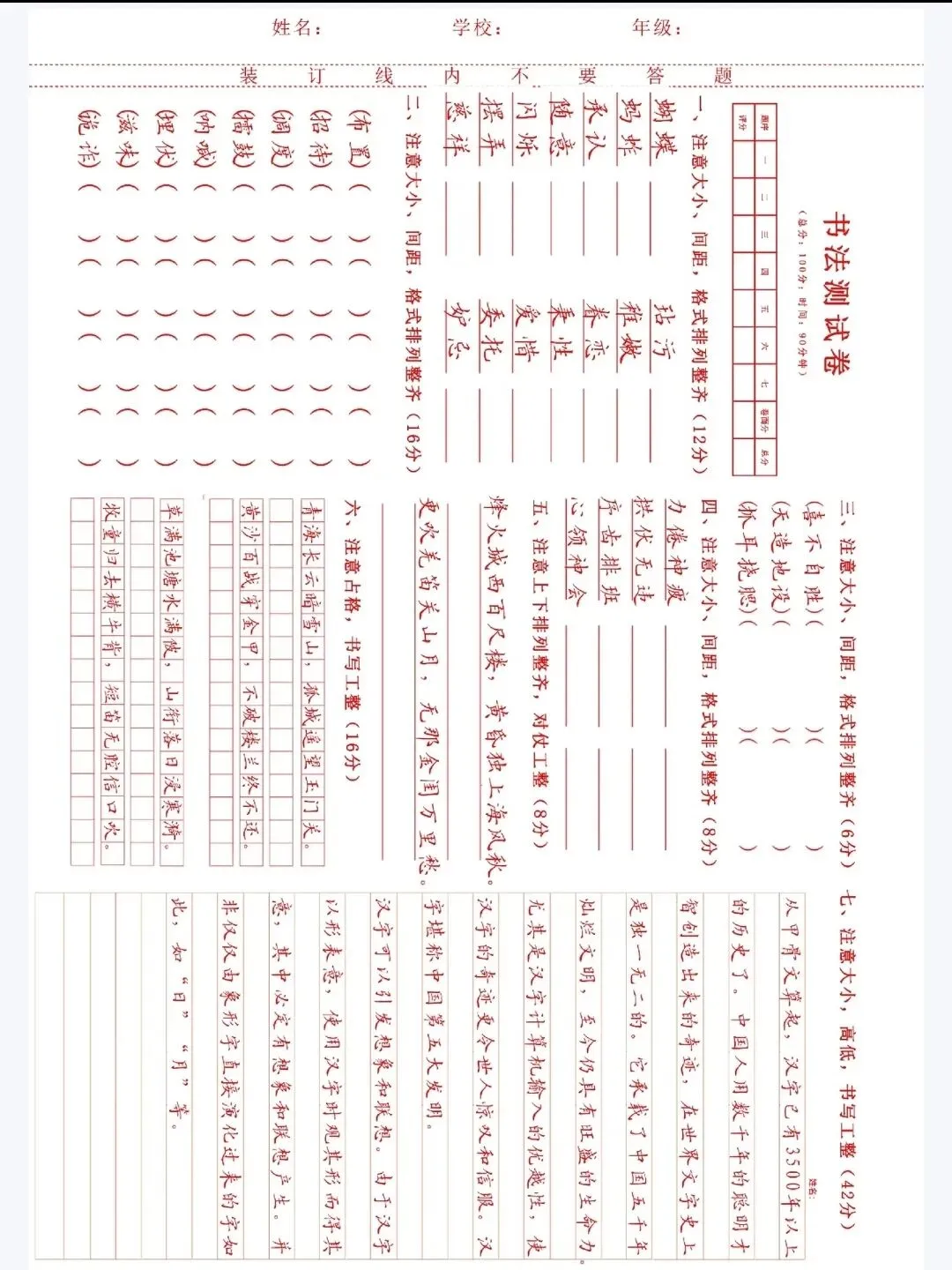 书法试卷,测试题.