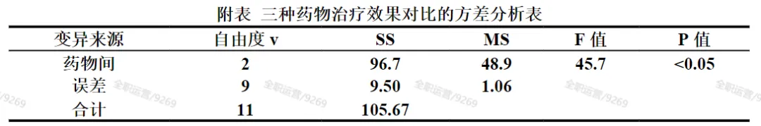 验证:-组数k=3(3种药物)-组间自由度v组间=k-1=2 ✓-组内自由度v组内=N-k=12-3=9 ✓总自由度v总=v组间+v组内=2+9=11 ✓