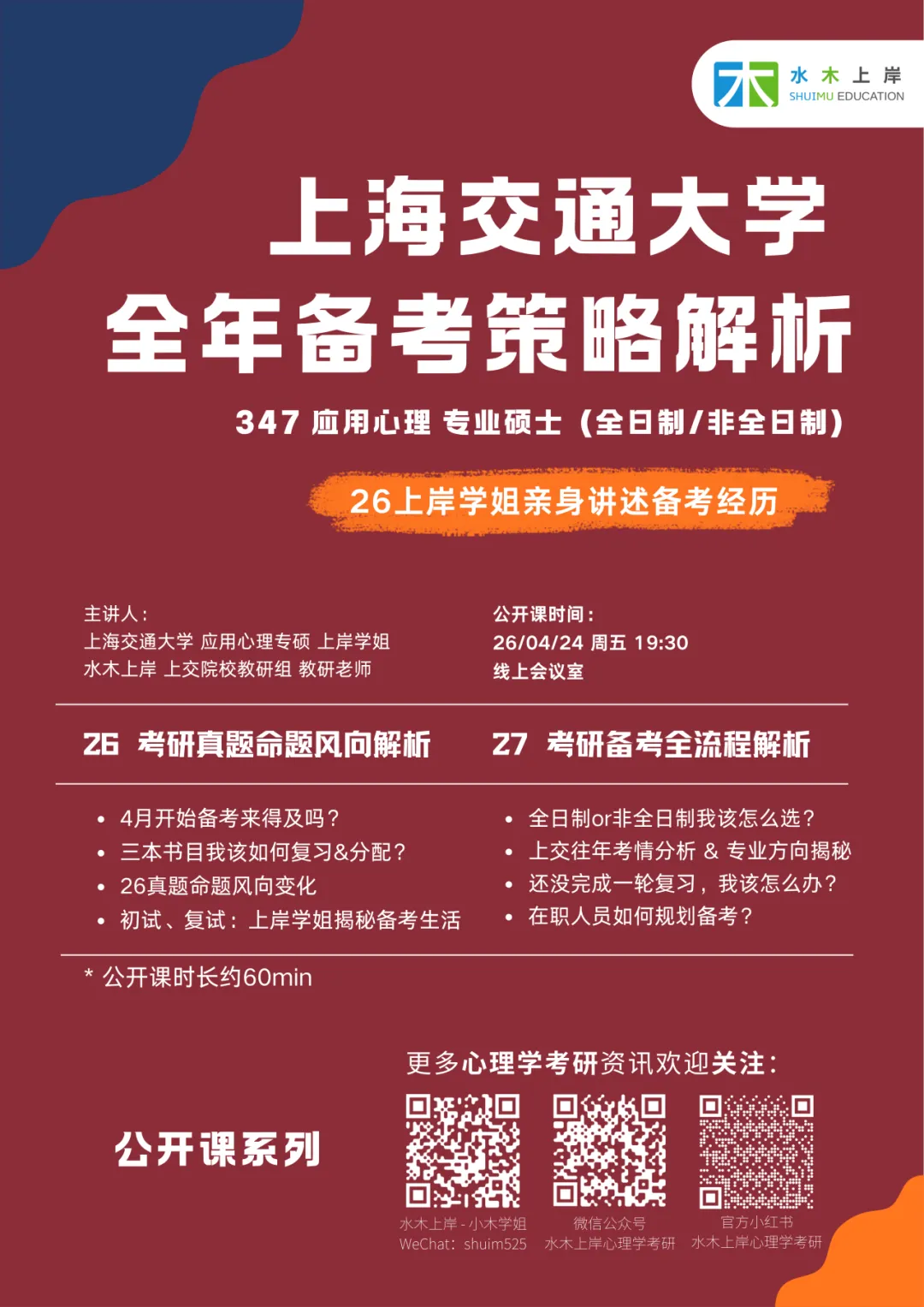 4月24日(周五)晚19:30,水木上岸邀请26级上岸学姐与上交院校教研组老师,用一场线上直播,系统拆解27考研全年备考策略。内容覆盖:26真题命题变化、三本参考书复习节奏、全日制与非全选择、在职备考方案、初复试真实经历,以及直到12月的全流程时间轴。