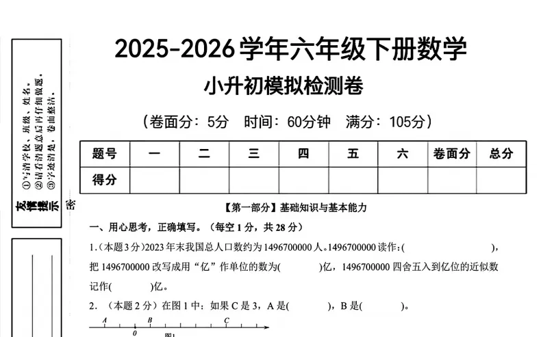 2025-2026小升初语文试卷、小升初数学试卷,空白试卷和答案,可下载打印.