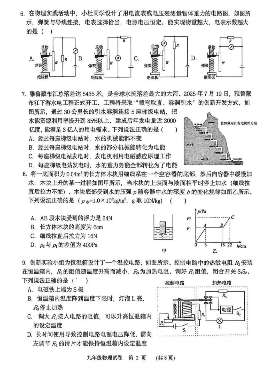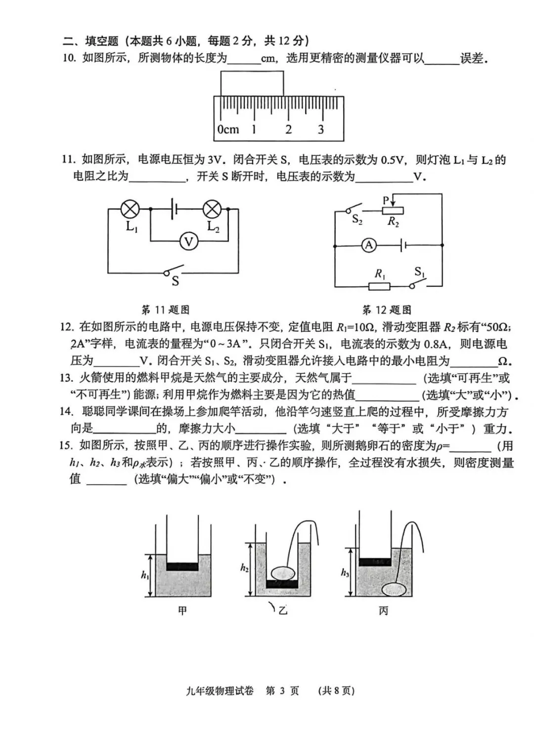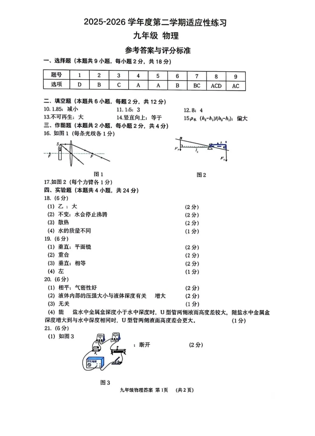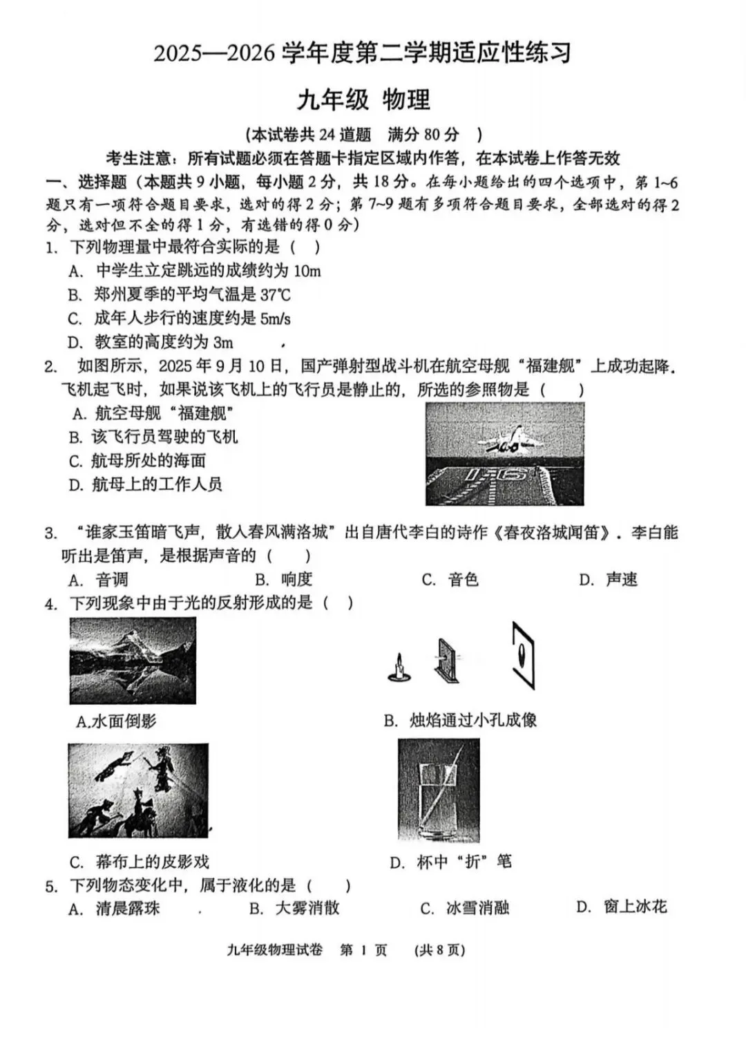 本套九年级物理适应性练习试卷整体贴合中考命题导向,结构清晰、考点全面,兼顾了基础考查与能力区分,能有效检验学生二轮复习的阶段性成果。试卷涵盖了力学、热学、光学、电学、电磁学等核心板块,题型设置与中考保持一致,其中选择题、填空题侧重考查基础知识的掌握,实验题与综合应用题则突出对实验探究、逻辑推理和计算能力的检验。从基础题来看,第1-5题的生活物理量估测、参照物、声音特性、光现象、物态变化等题目,紧扣教材核心概念,大部分学生能顺利完成,反映出基础概念的掌握较为扎实。但第6题的电表改装、第8题的浮力与压强综合题,对学生的电路分析和受力分析能力提出了较高要求,容易成为失分点。填空题中,第10题的刻度尺读数、第11题的串联电路计算、第15题的密度测量,能有效区分学生的基础计算能力和实验误差分析能力。