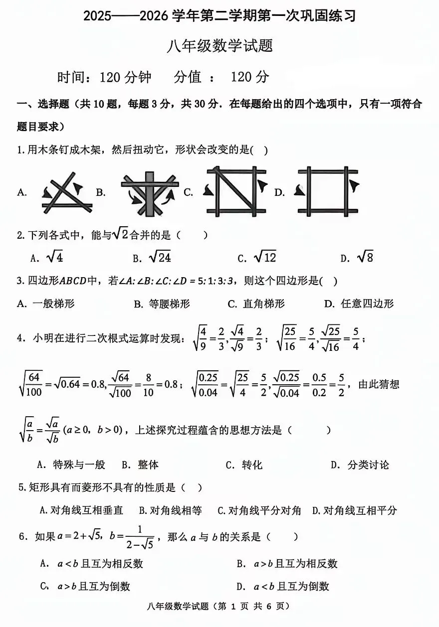 【期中数学试卷】2025-2026学年八年级下学期期中监测卷(人教)