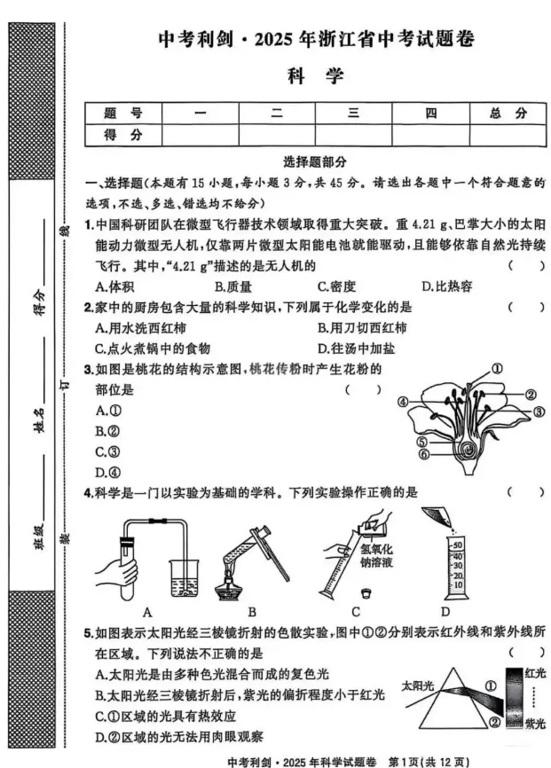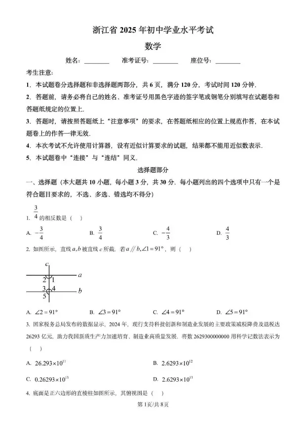 2025年浙江省初中中考真题试卷+答案解析,PDF高清电子版,可下载打印!