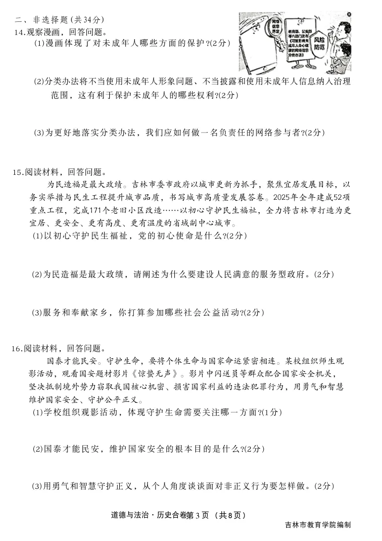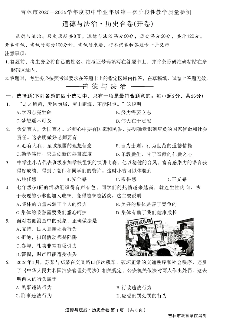 >【最新试卷】2026吉林市初三一模政治历史试卷