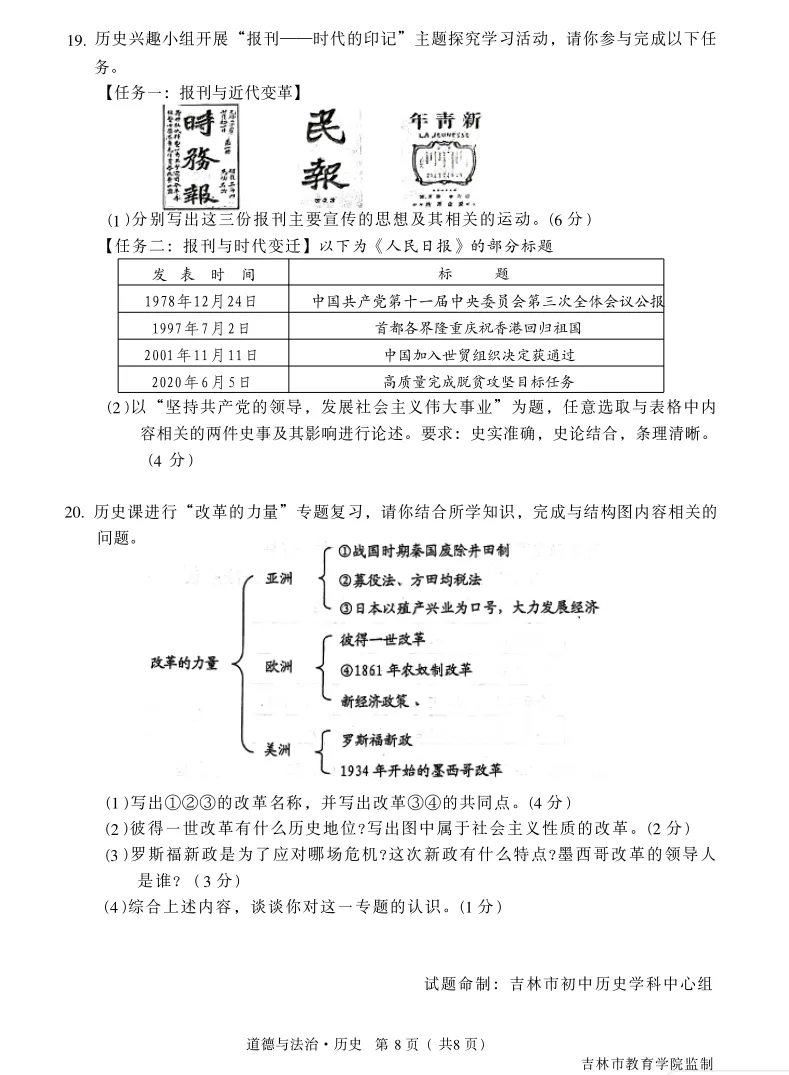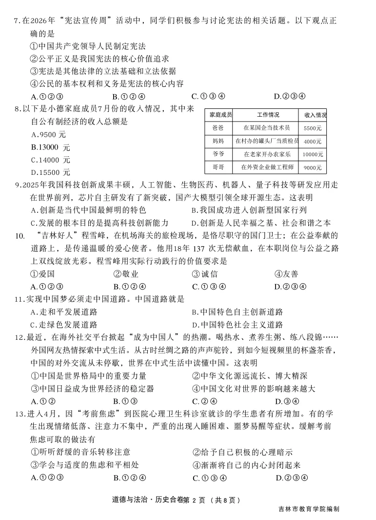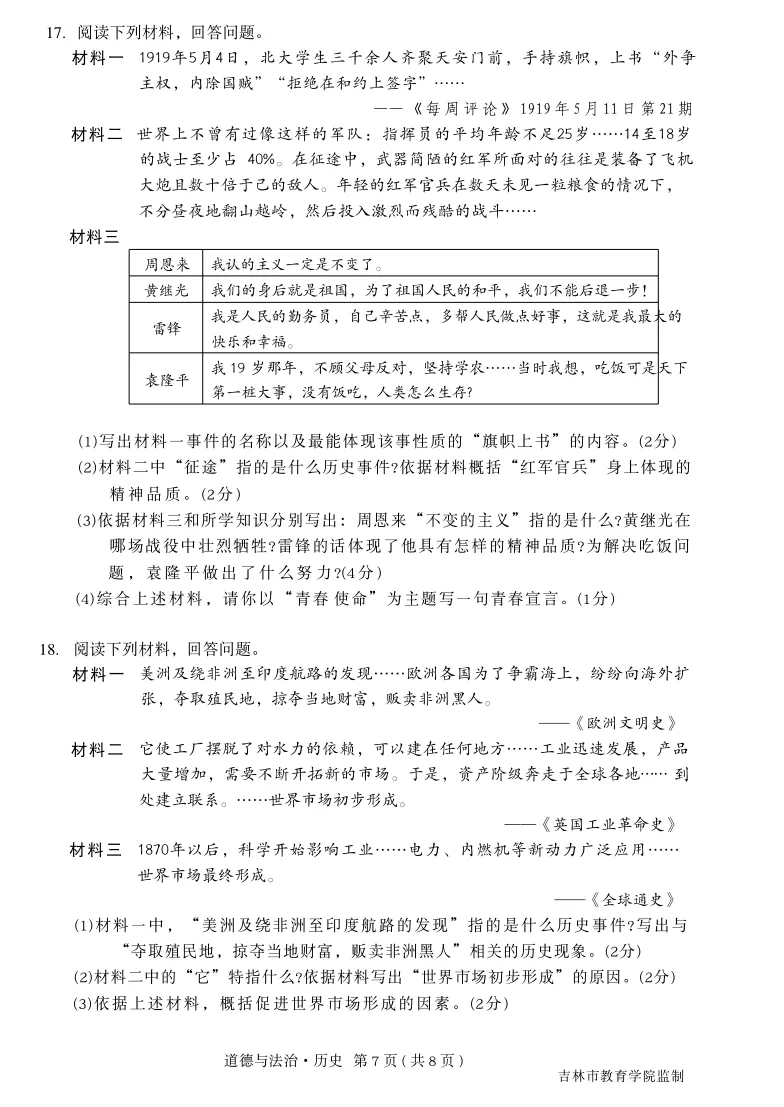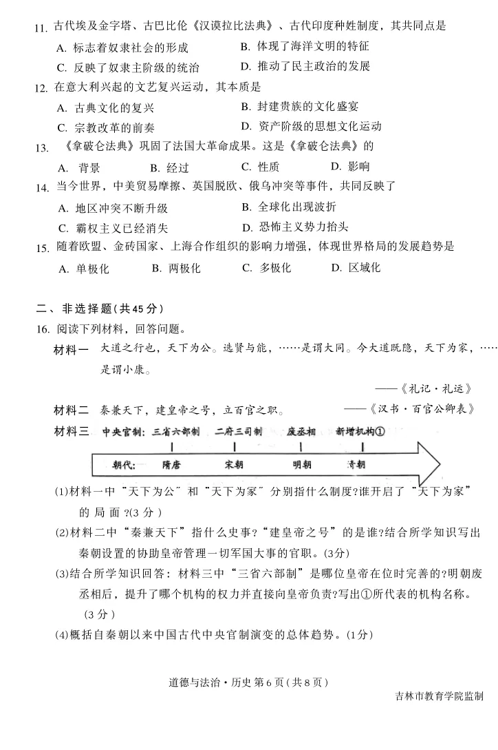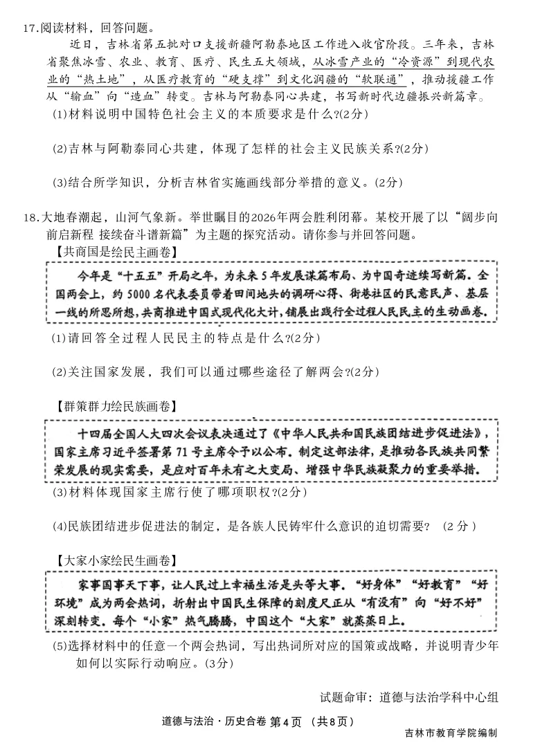 【最新试卷】2026吉林市初三一模政治历史试卷