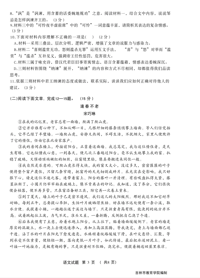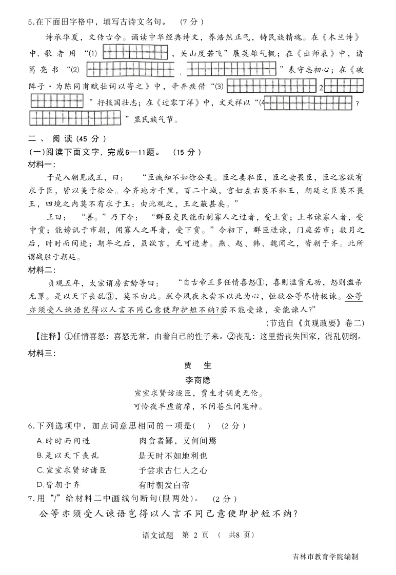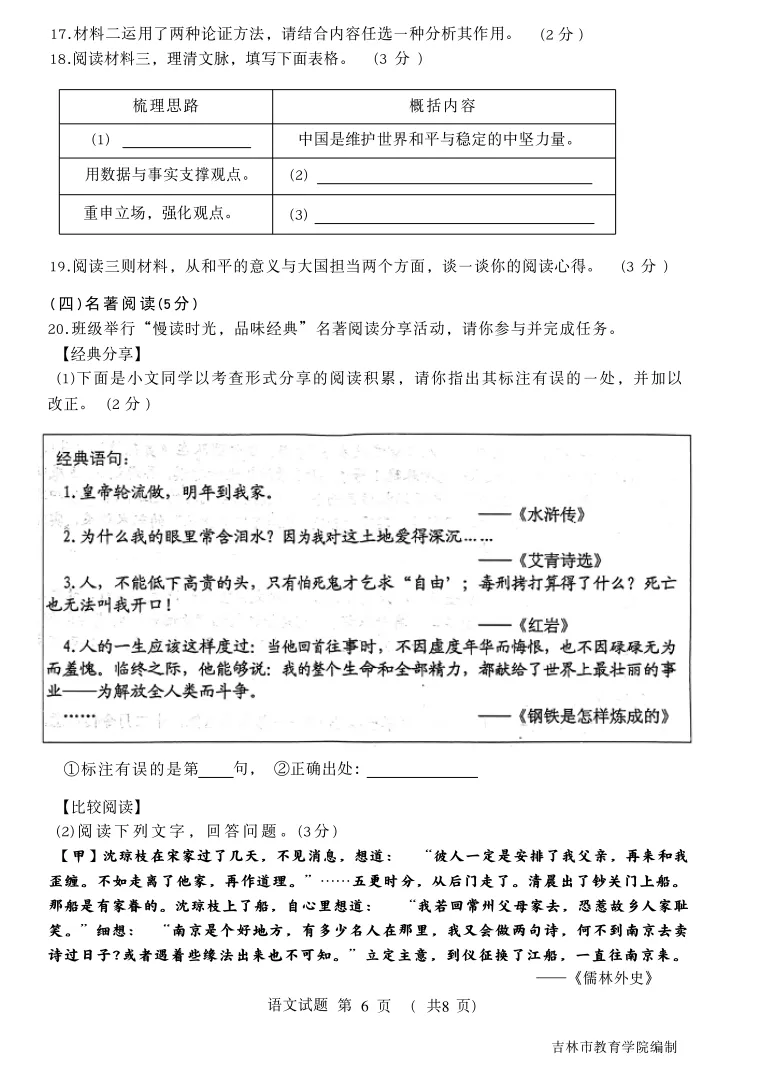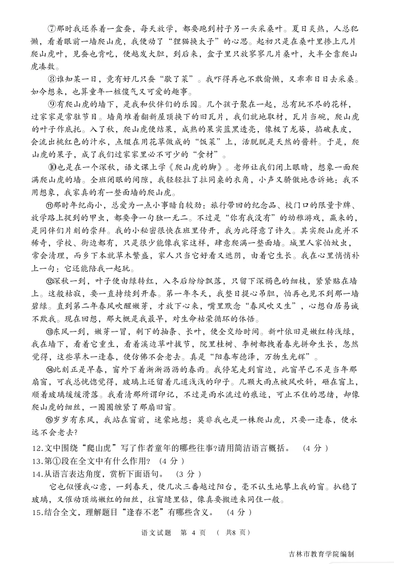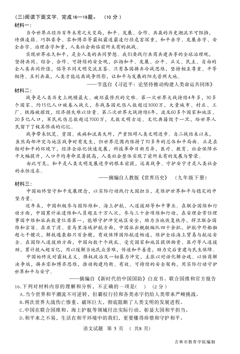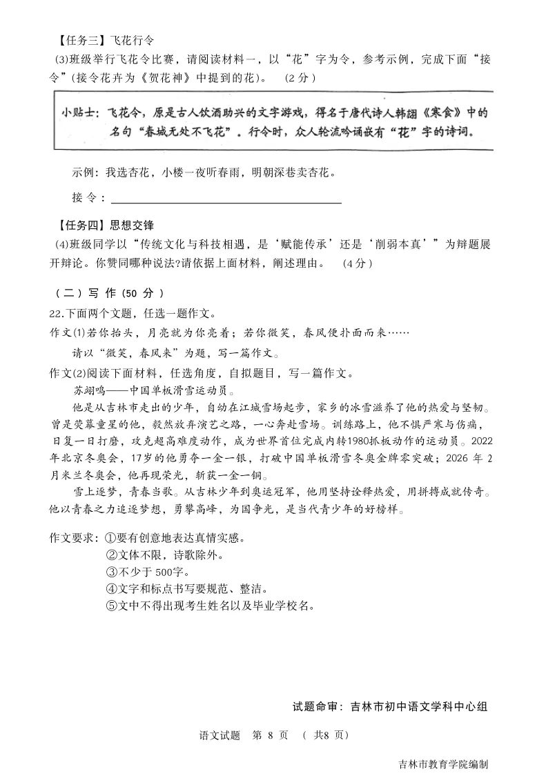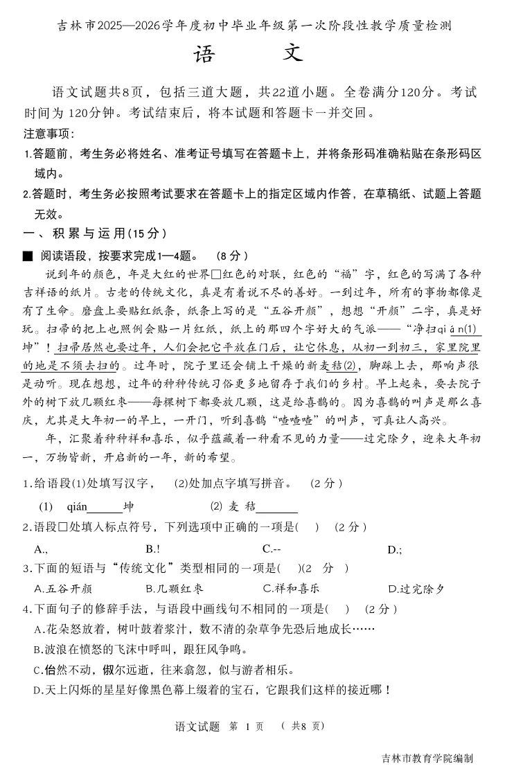 【最新试卷】2026.04.21吉林市初三一模语文试卷