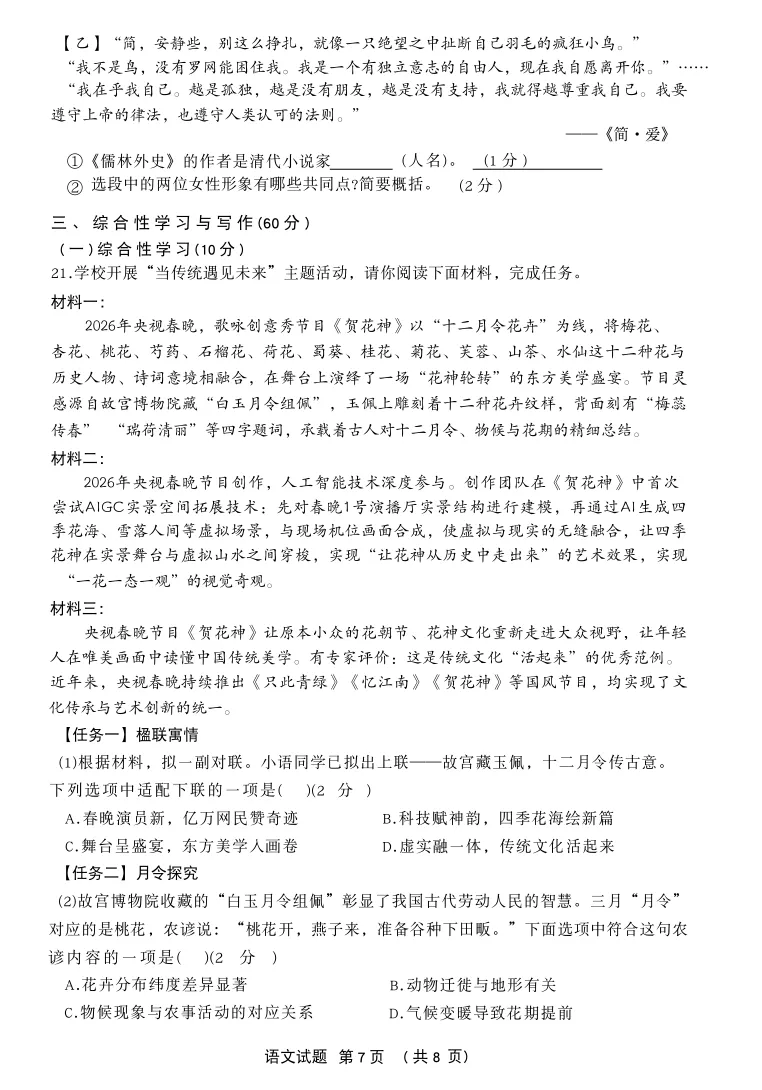 2026年杨浦区初三二模语文试卷
