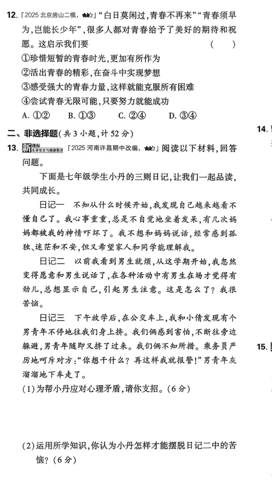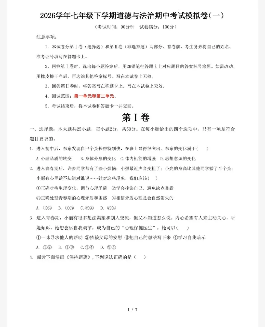 大家好,这里是同城家长汇,今天要给大家带来的是2026年春新版人教版道德与法治7年级下册单元试卷测试卷及答案含期中期末综合素养评价试卷,高清pdf电子版,文末免费领取!