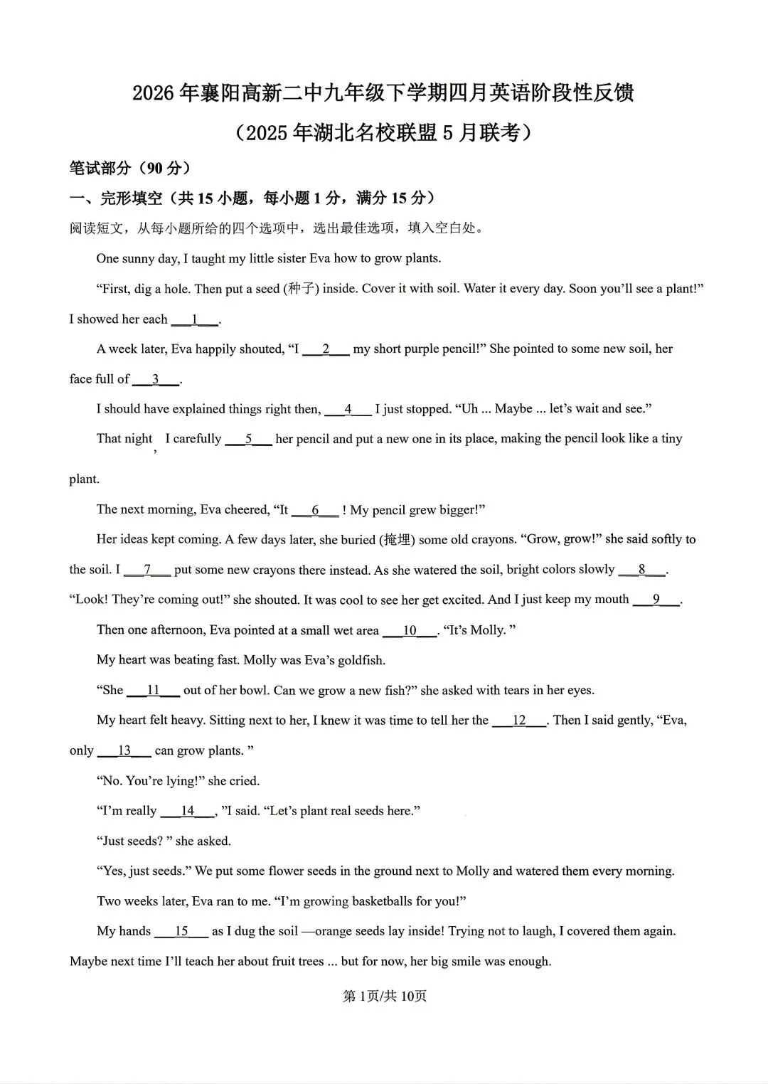 英语最新!9下26年襄阳市高新二中一模英语