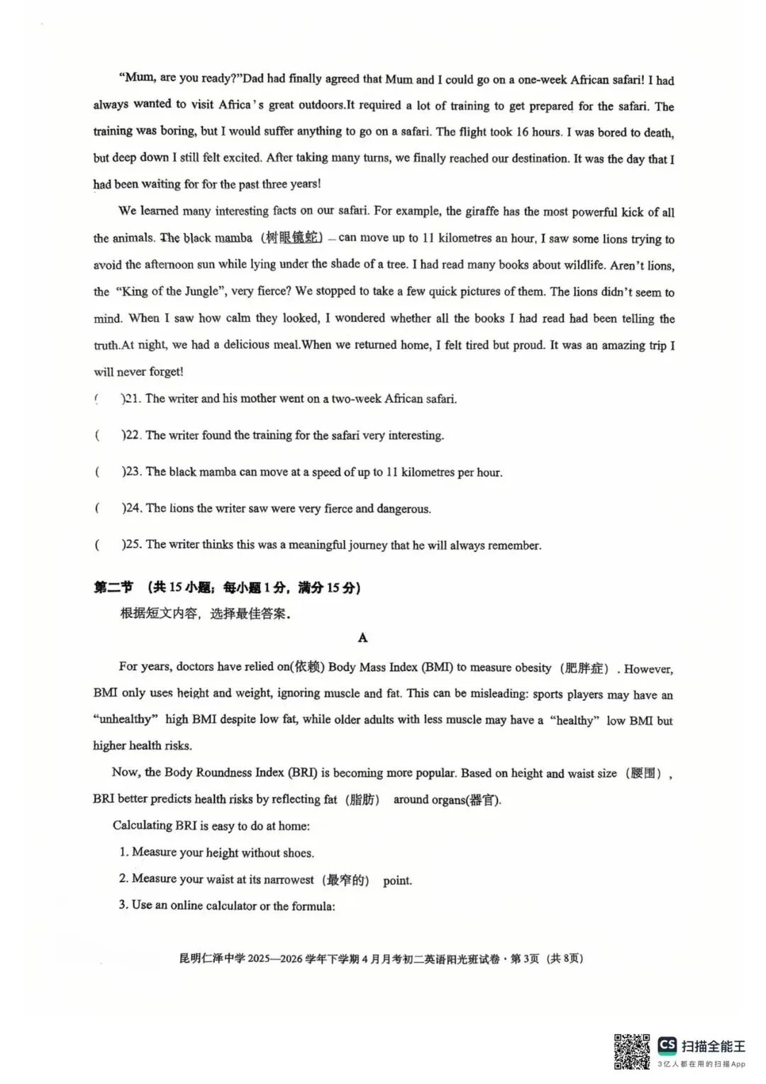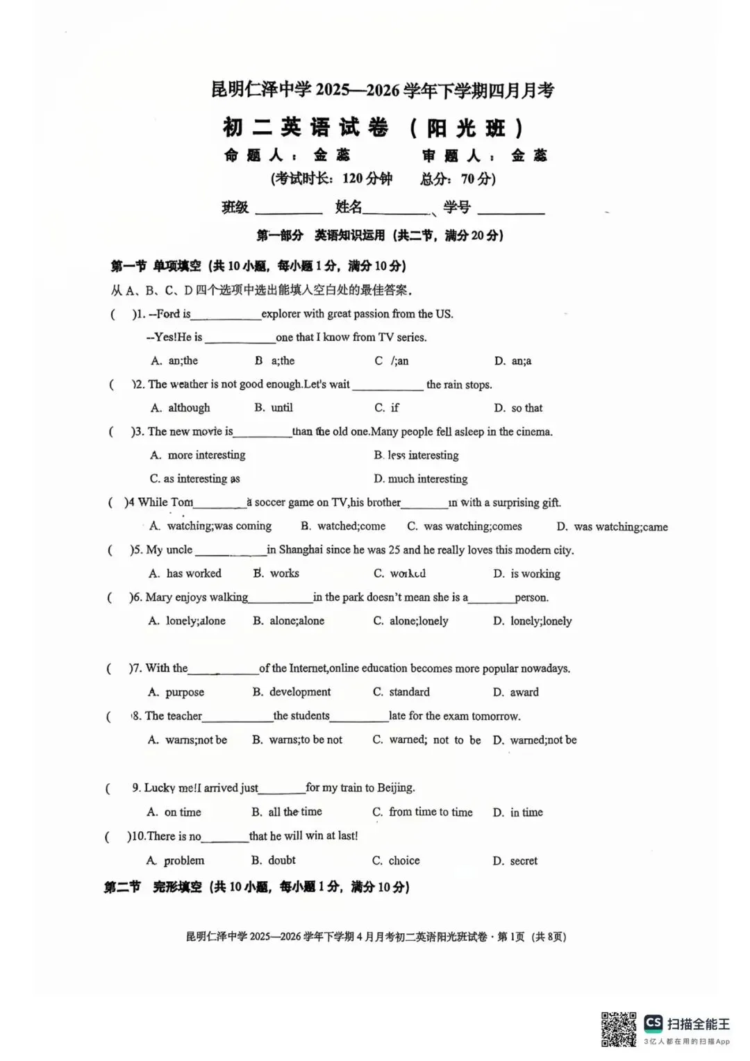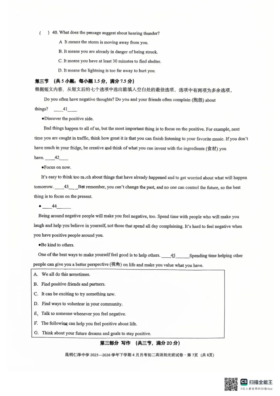 昆明仁泽中学四月月考英语试卷(八年级)