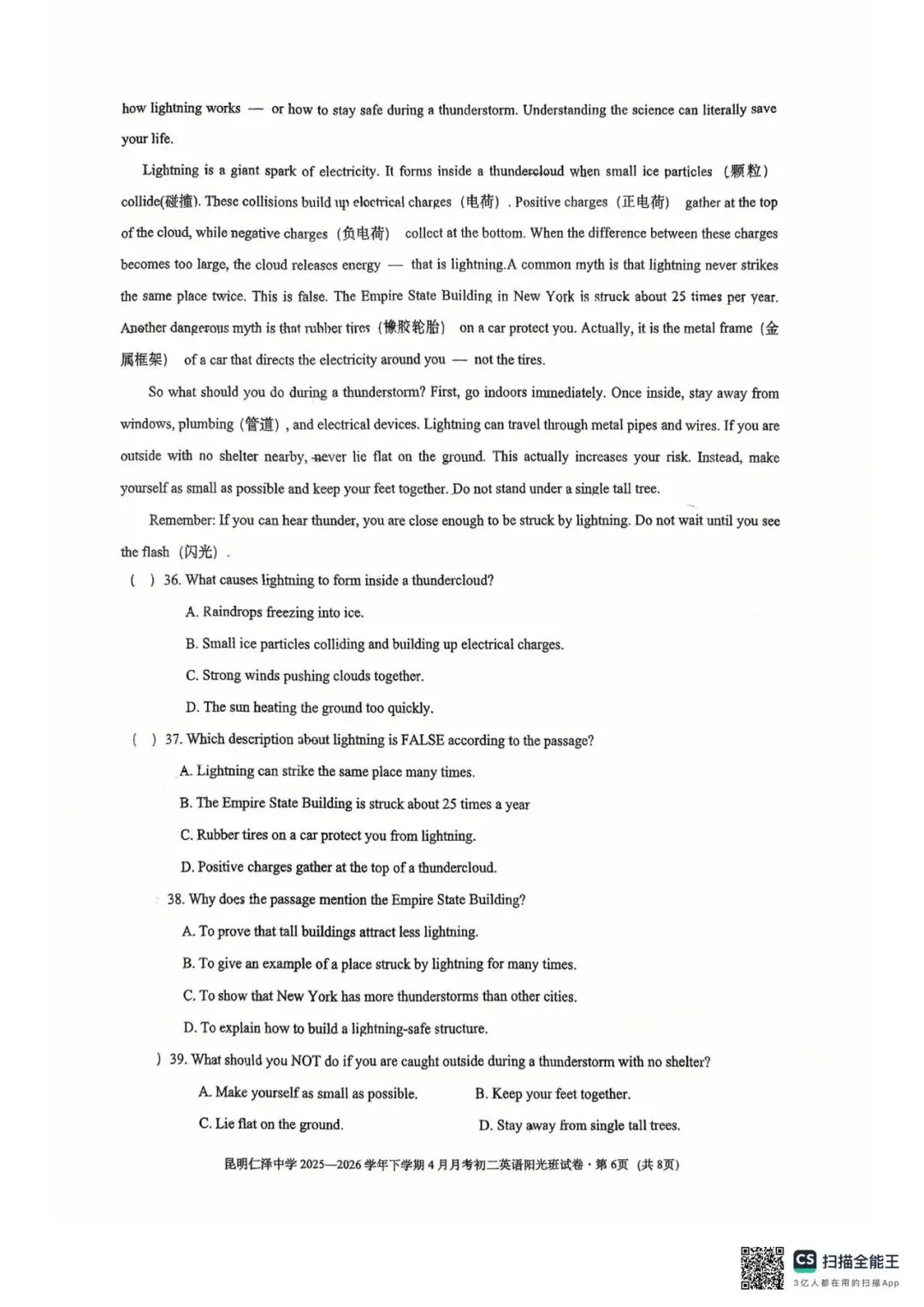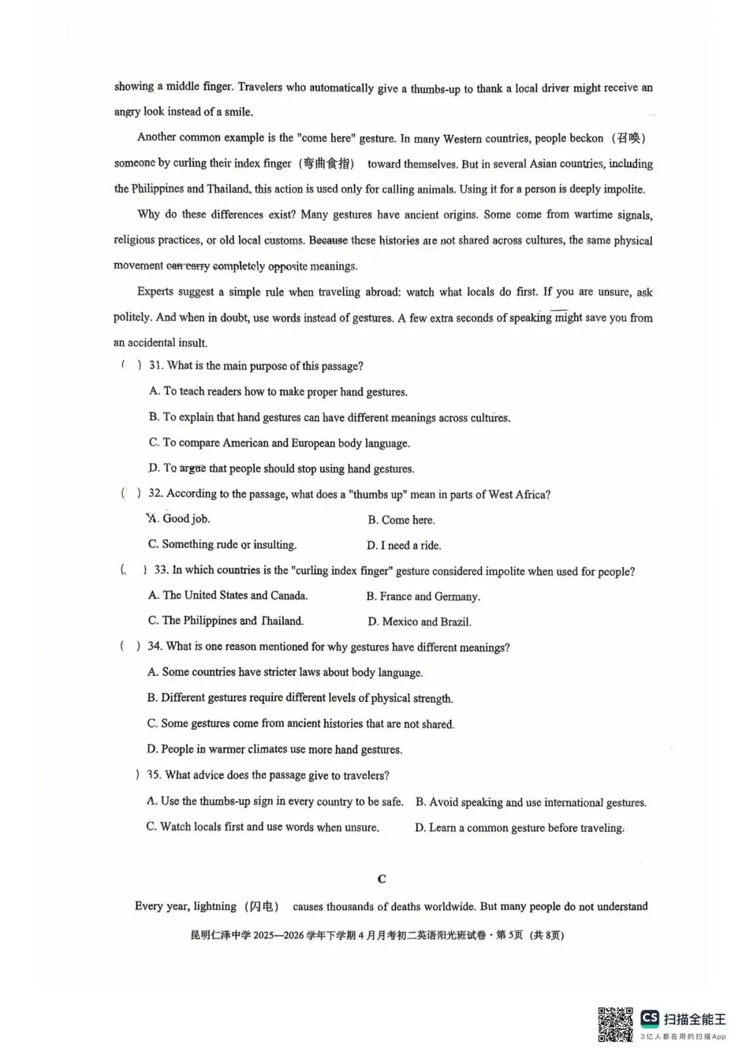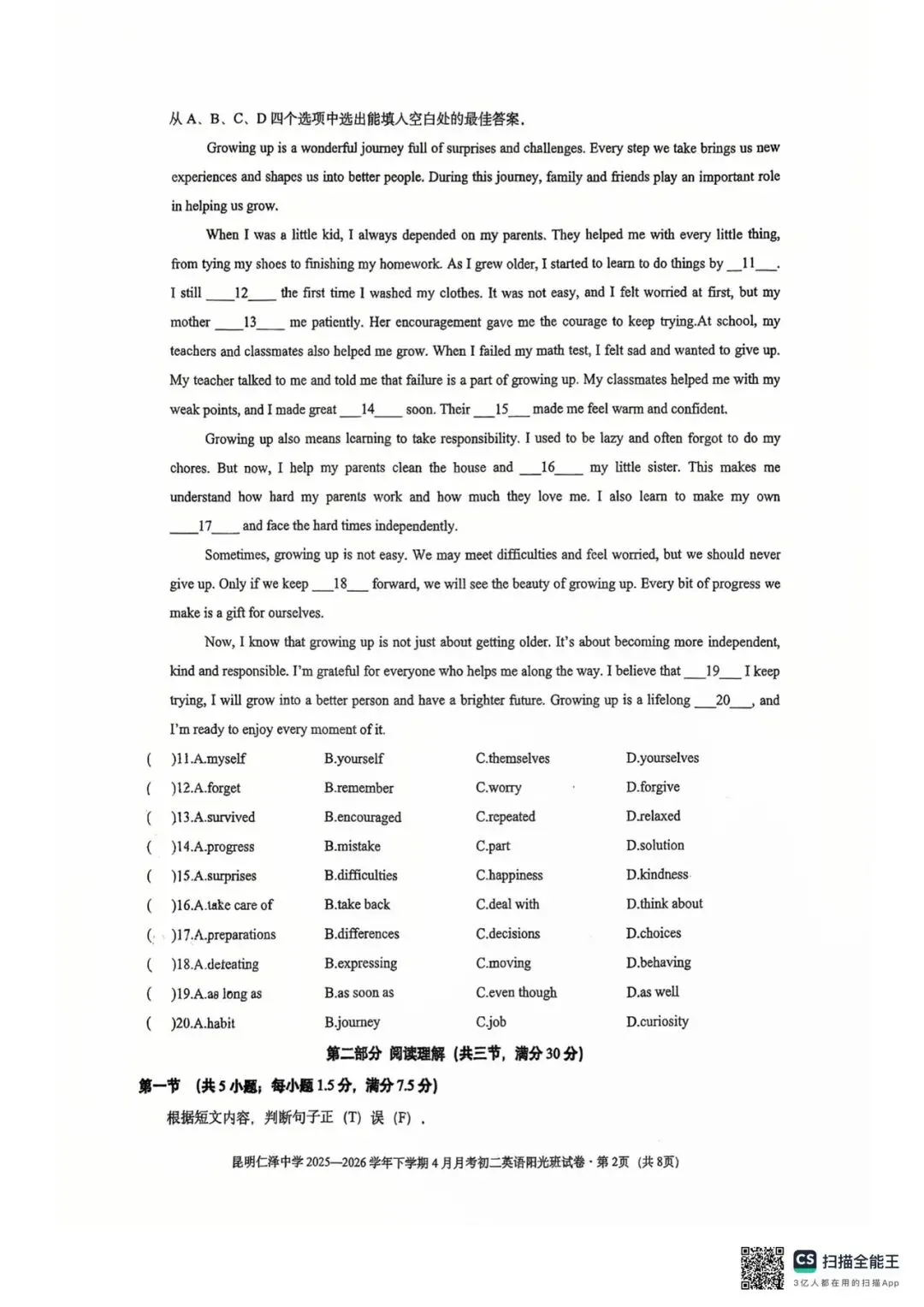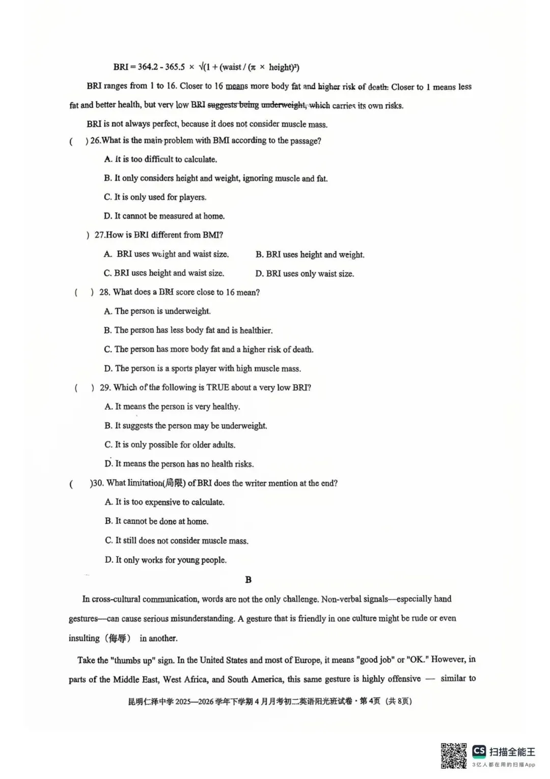 昆明仁泽中学四月月考英语试卷(八年级)