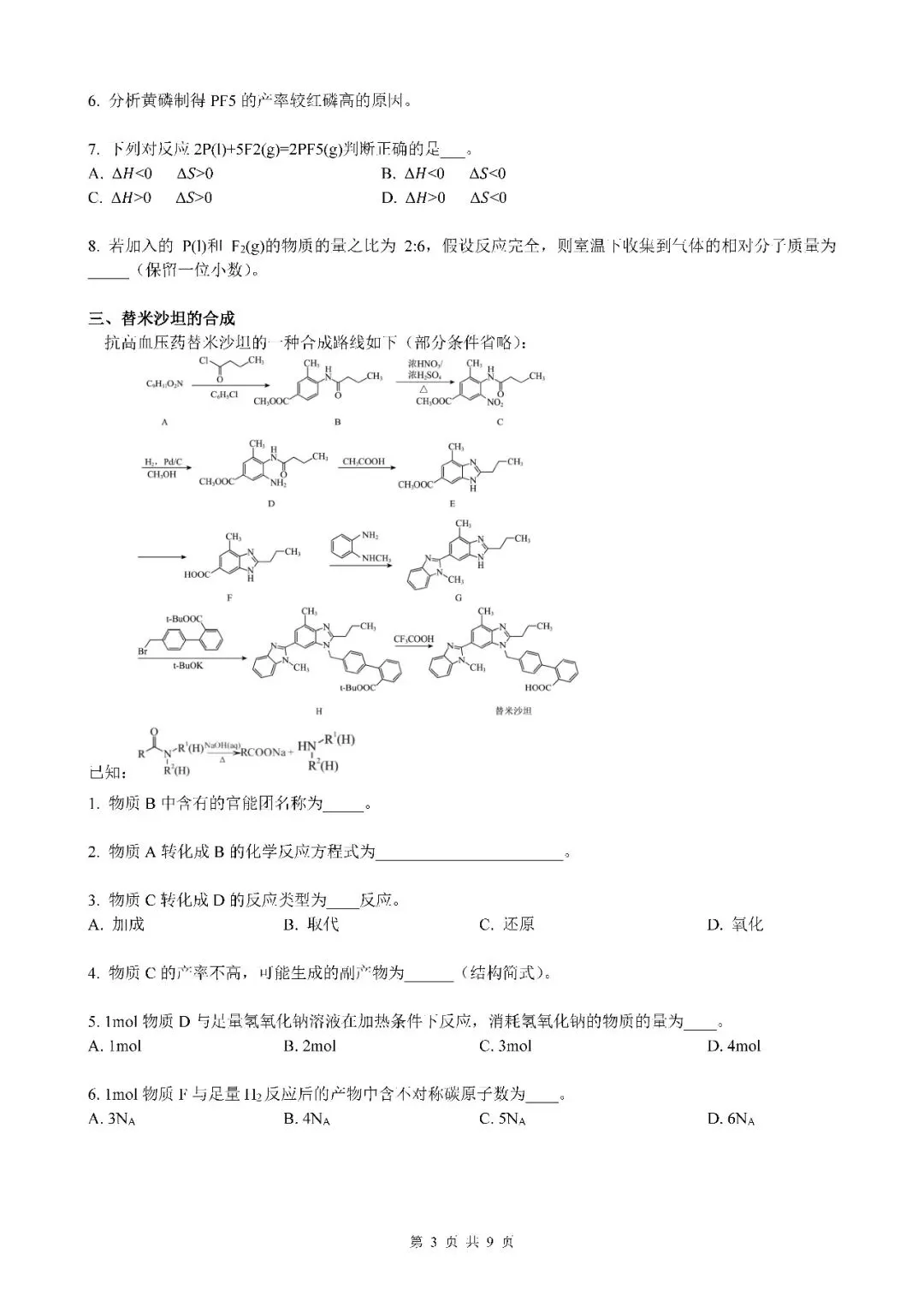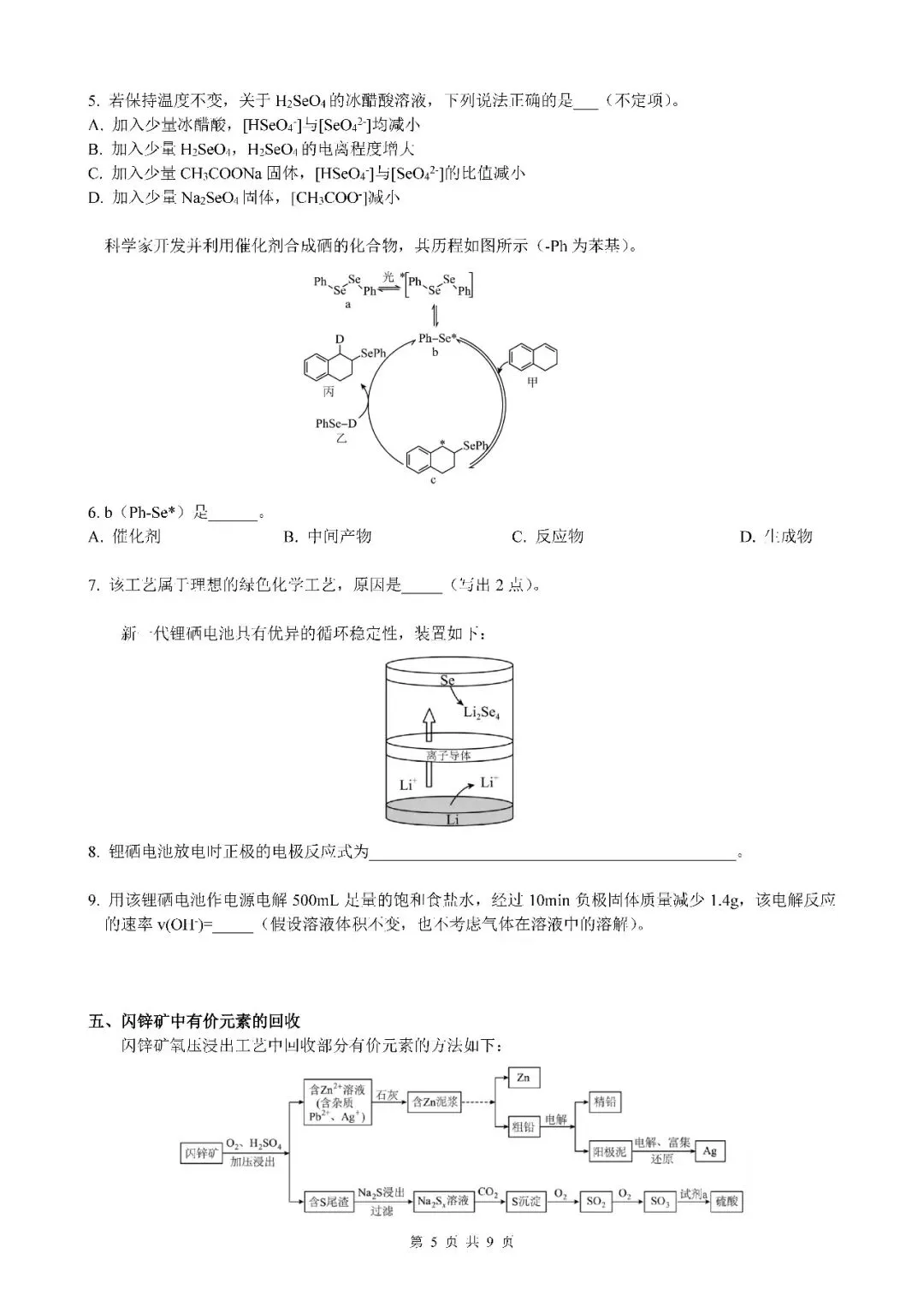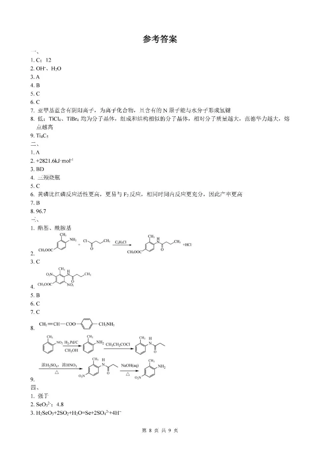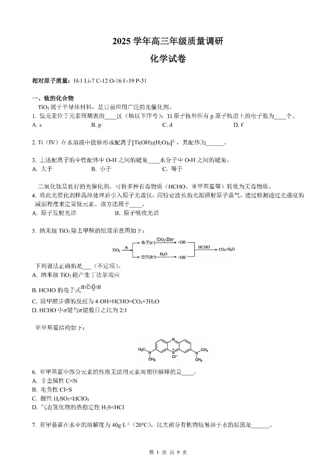 2026届上海市嘉定区高三二模化学试卷(含答案)