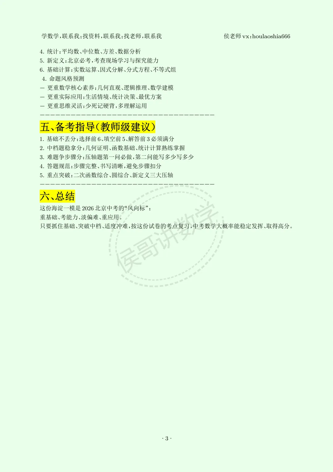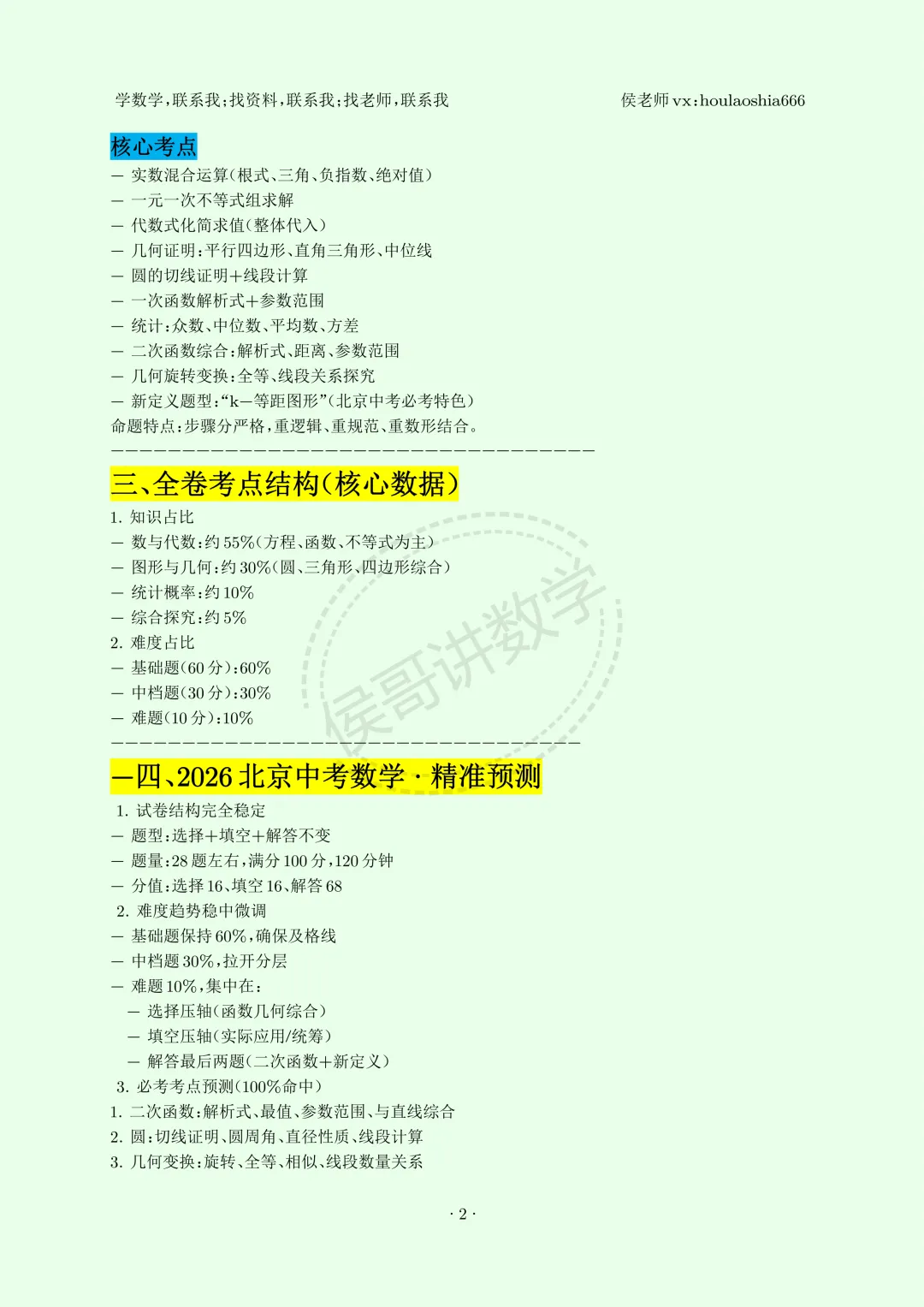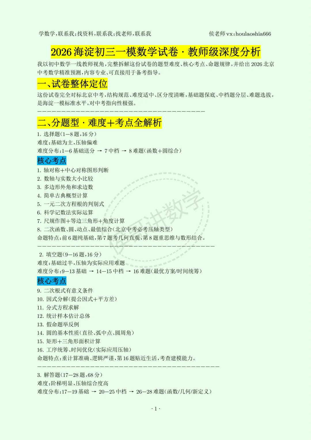 我以初中数学一线教师视角,完整拆解这份试卷的题型难度、核心考点、命题规律,并给出2026北京中考数学精准预测,内容专业、可直接用于备考指导。