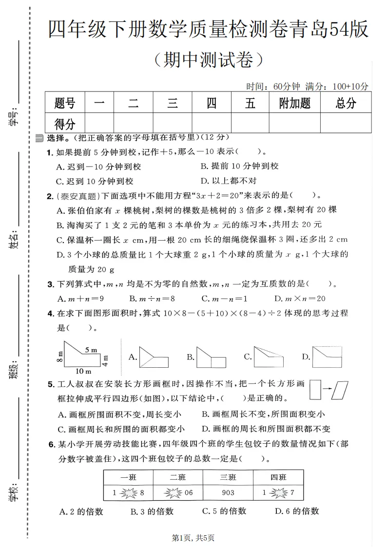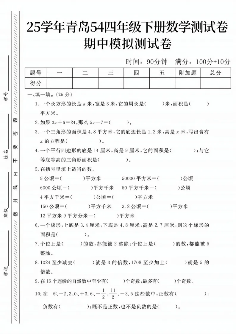 为大家更新了最近超火的学习资料26春新版四年级下册青岛54制数学期中试卷,情境卷,质量达标卷、拔尖测试卷等多套,文末可以下载题型丰富,非常适合孩子练习,为下学期的学习奠定基础,有需要的家长快给孩子们打印练一练,及时查漏补缺吧。建议分享到班级群/年级群,让其他家长打印出来,帮助孩子学习!(温馨提示:资料为高清文档,因篇幅限制,仅展示部分内容,文末有完整高清电子版领取方式)