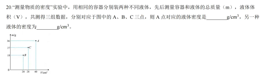 这道题先理解题意:三个容器装两种液体,一定有两个容器种是同种液体,同种液体的话,就可以连接成一条直线,连接AB,AC,BC就可以发现与m轴的交点即为容器的质量,AB,BC与m轴相交的点都为负值,但容器的质量不可能是负的,所以这个时候说明AC是同种液体,剩下的就不难了。