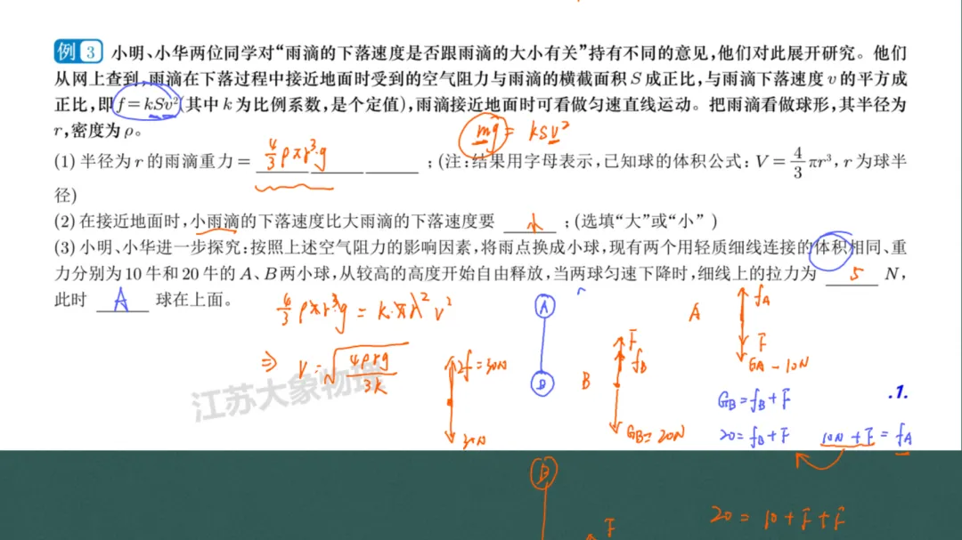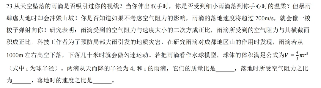 力和运动章节经典的阻力问题,有难度,玄外去年期中考过,我们上课时也讲过类似题。要能够根据题干的正比关系,写出阻力与横截面积及速度的表达式。再根据根据重力和阻力相等,列出对应的平衡方程,得到速度与阻力的具体比例关系,对于平时见得少的同学,属于有难度的题目。