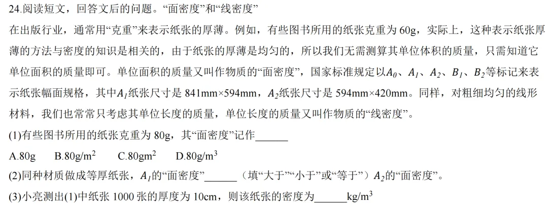 面密度线密度问题。这类题紧密练习生活实际,所以考频也比较高。关键是理解两个密度的含义,能够写出计算式,并和体密度进行换算。
