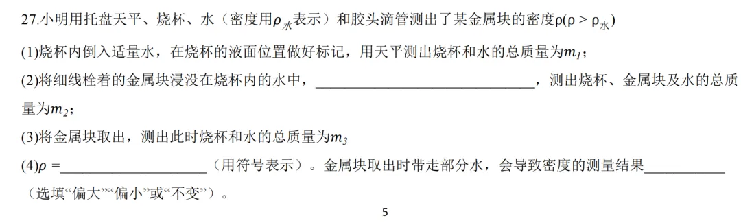 考察特殊法测密度,有一定难度,与补水法的思路是一样的,关键是使水面到达标记处。但是这个题换了个思路,不是补水,而是要把多余的水吸走到达标记处,计算和补水法一样。m3是误差来源。由于质量和体积的测量值都偏大,与金中河西去年月考对补水法的考察一样。从数学角度俩看,m3偏小,可以用糖水不等式判断误差大小。从物理角度看,计算的是金属块及其带走水的密度。