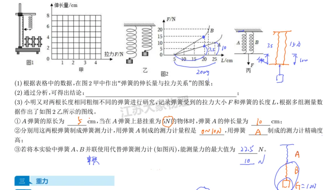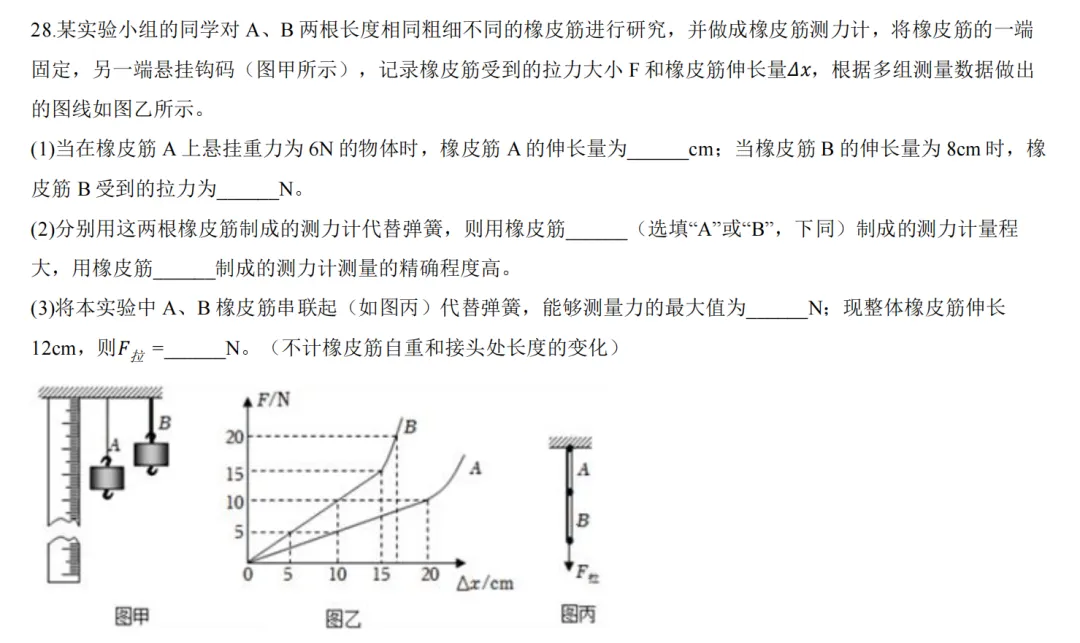 考了弹簧的串联,核心是两个弹簧拉力相同。最后一空有难度。平时考试以并联为主,串联考的少,但我们在课堂上都讲过了
