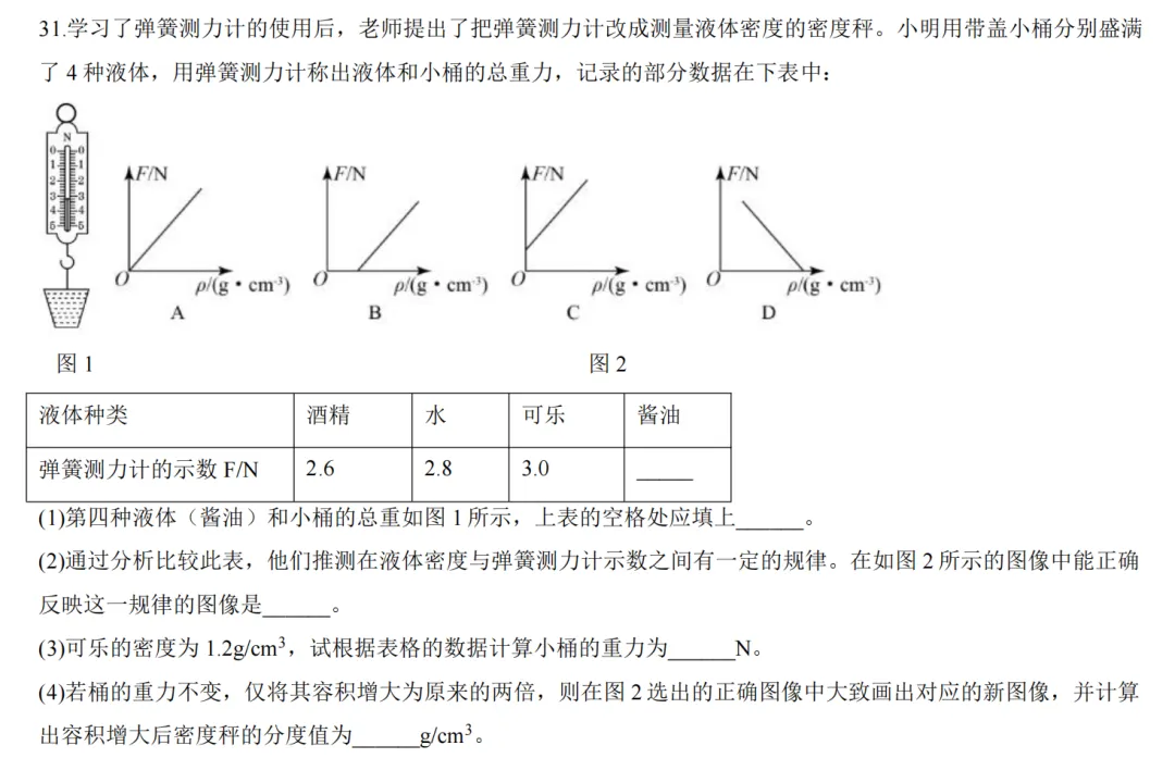 是大家必须掌握的弹簧测力计密度秤问题,要能够写出拉力与液体密度的表达式。要求画图,所以要明确直线斜率,以及与F轴交点的物理意义。求分度值,先要算下量程,再除以格数即可,要注意不装液体时是零刻度线位置。