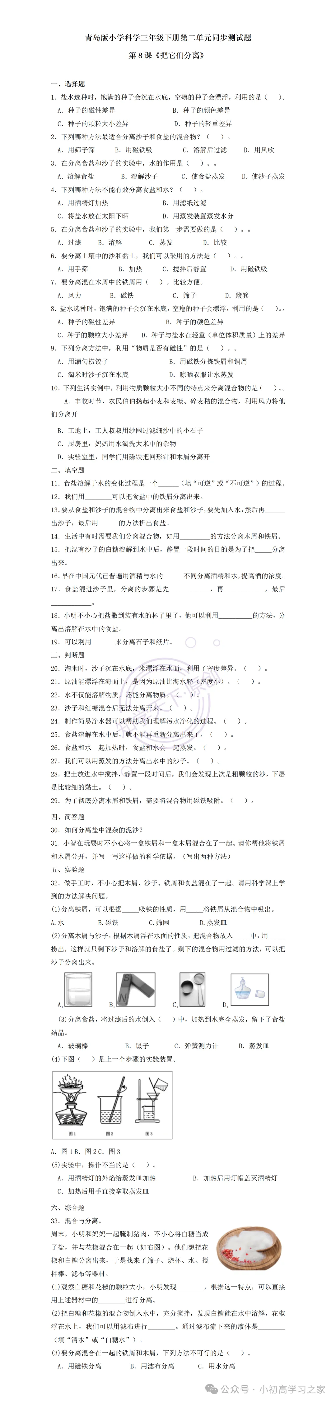 以上就是本期【青岛版三下科学第二单元第8课《把它们分离》单元检测试题】展示,请扫描下方二维码下载后修改使用~