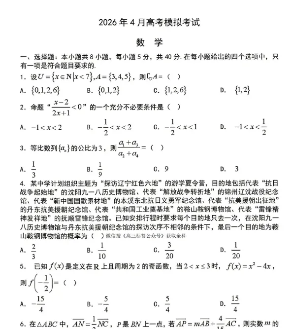 >【辽宁协作体】2026年4月高考模拟考试真题及答案解析