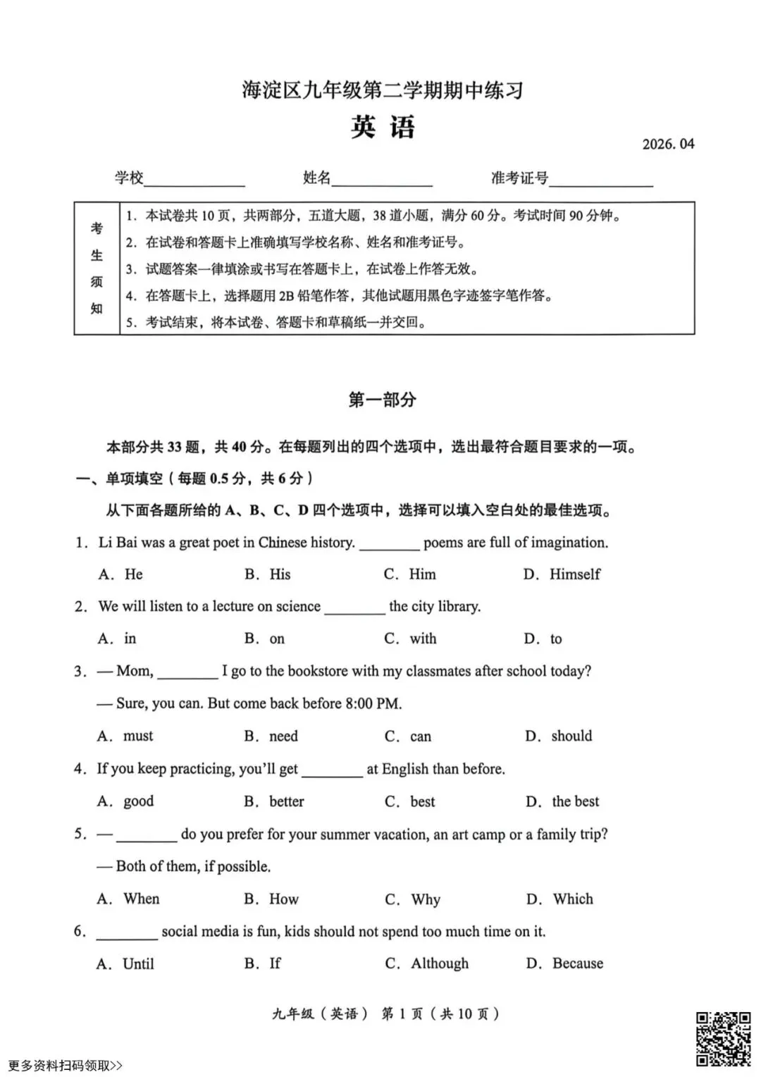 当前位置:首页>考研真题>2026北京海淀初三一模英语试卷(含答案)