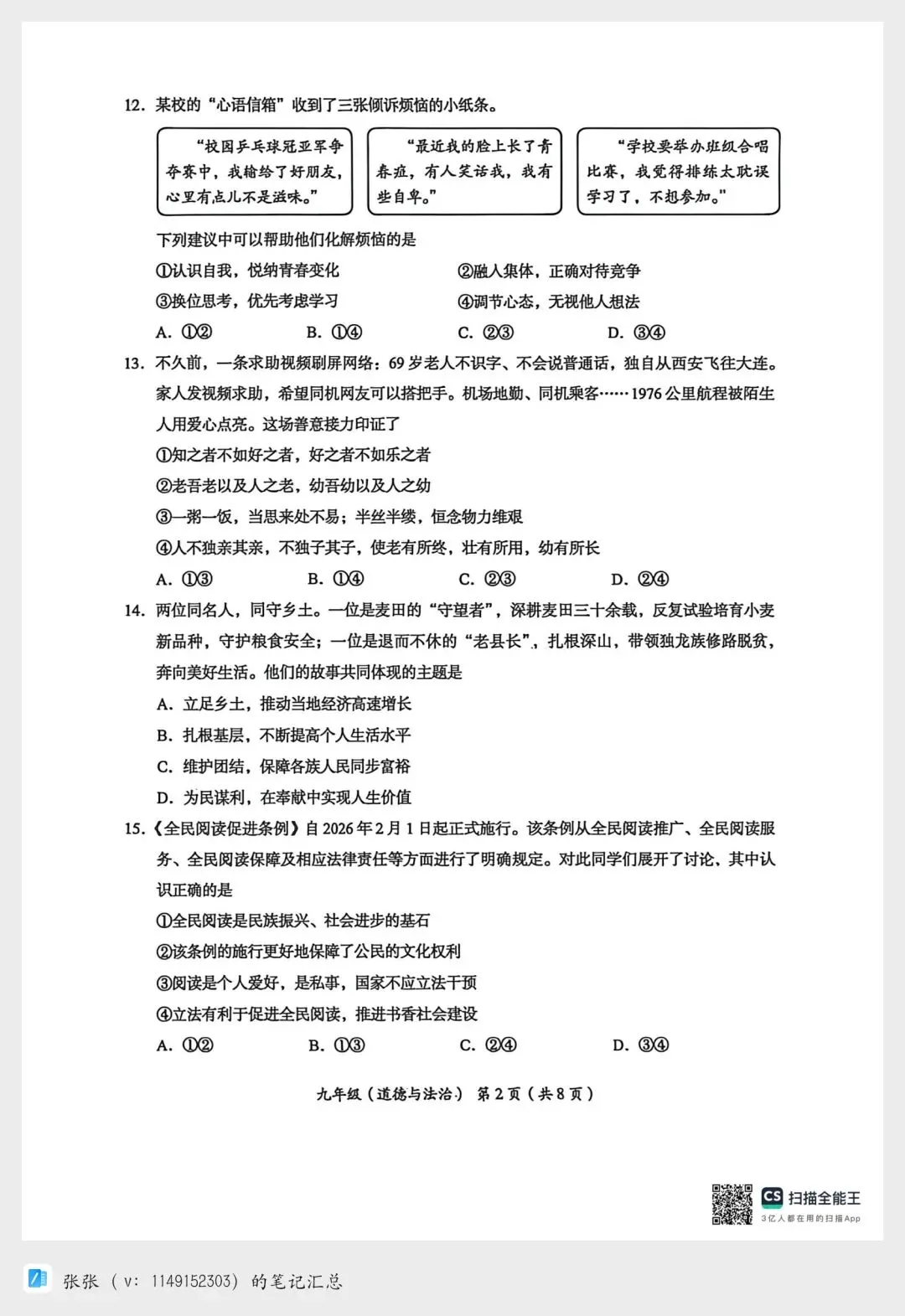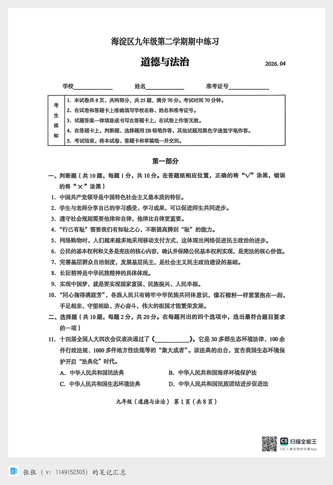 【2026北京海淀一模道法试卷】新鲜出炉喽!