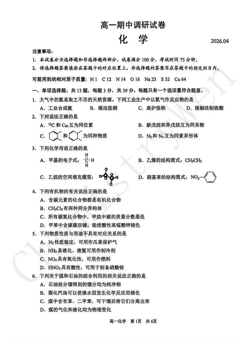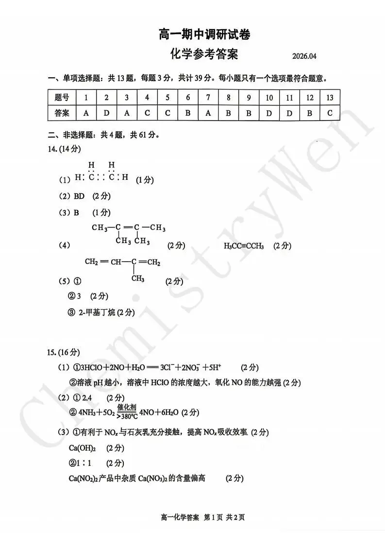 试卷精讲|2025-2026苏州一中高一(下)4月月考化学
