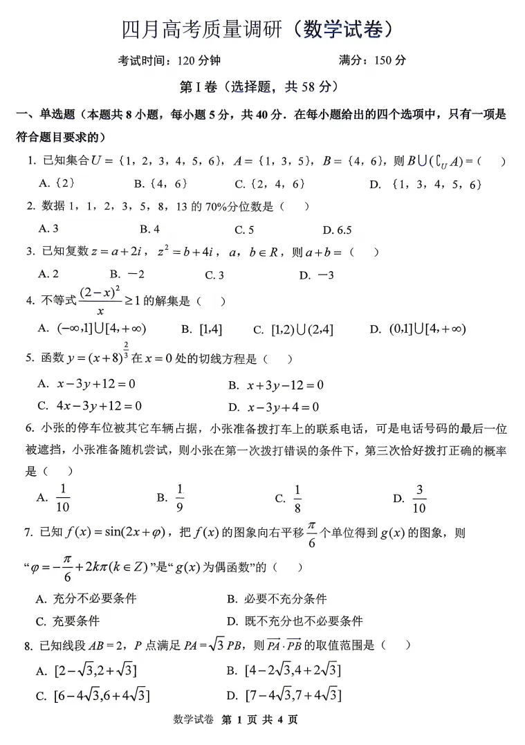 四月高考质量调研(数学试卷).pdf