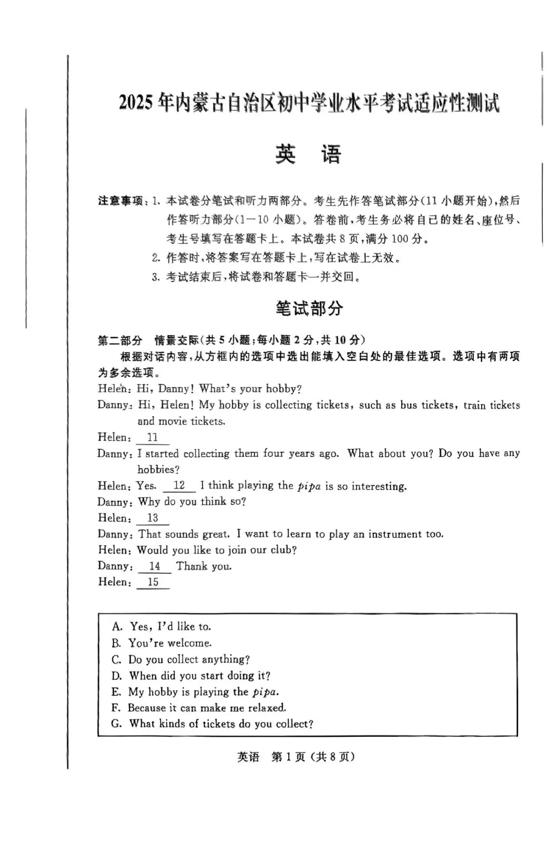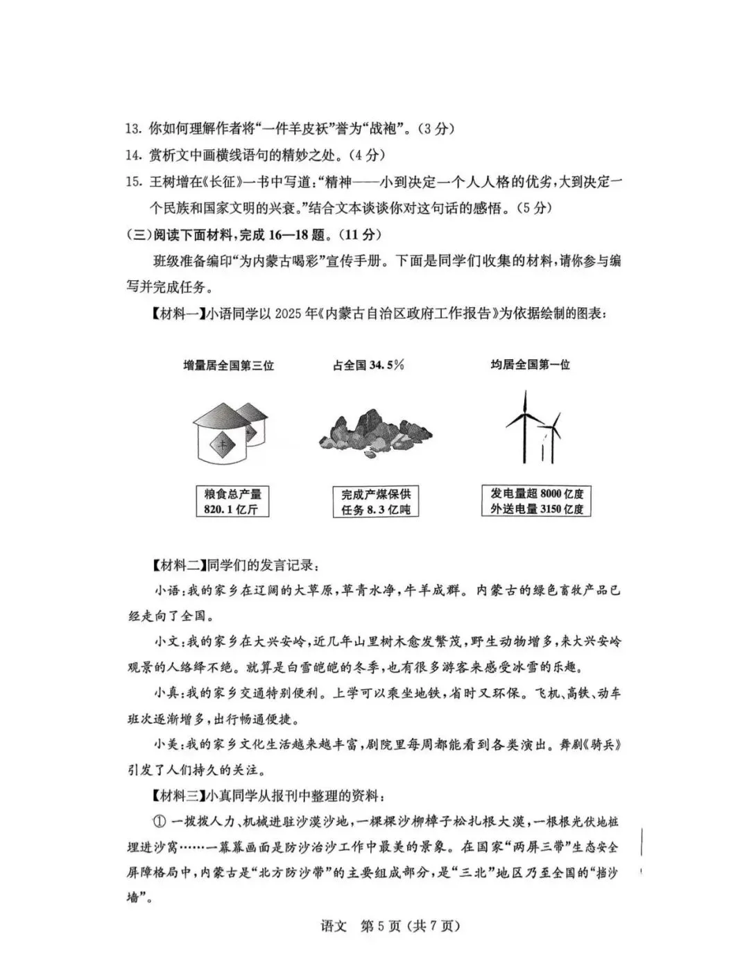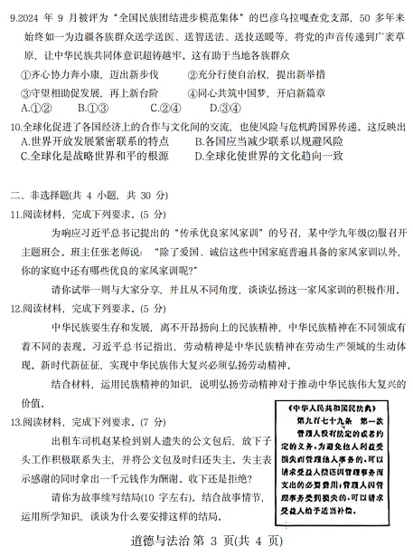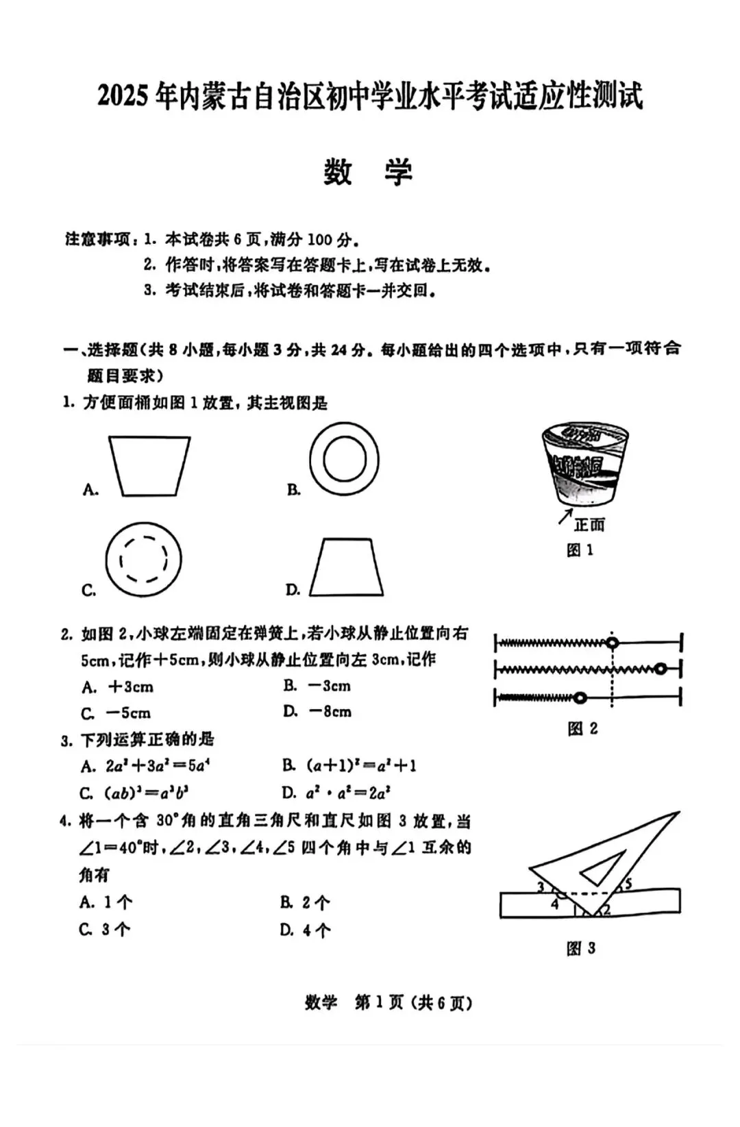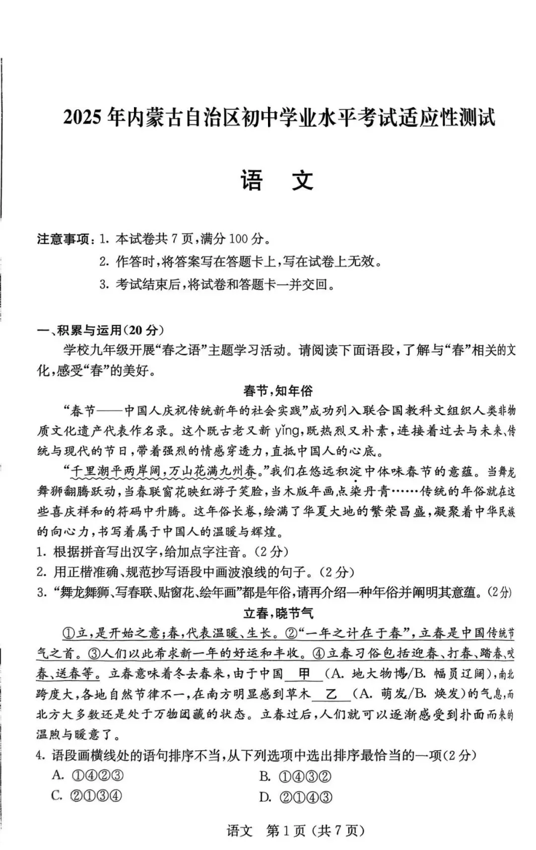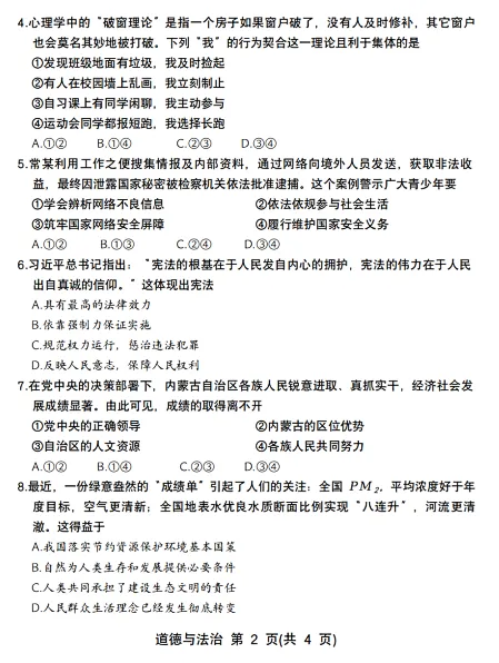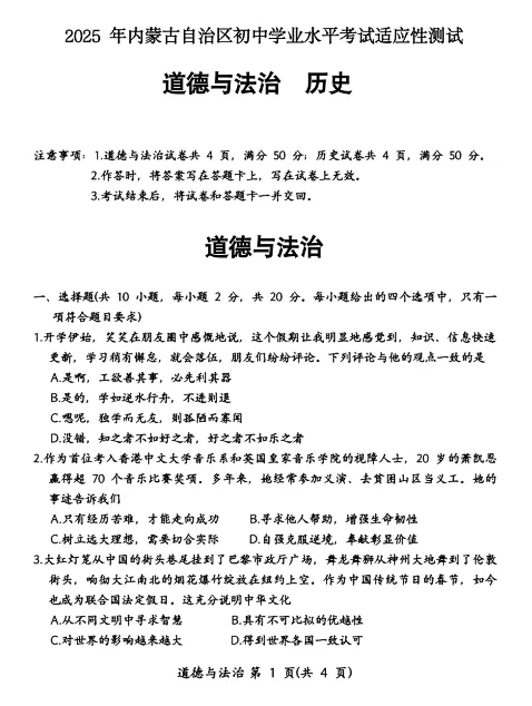 >2025年3月内蒙古中考适应性试卷和答案:语文数学英语物理化学道法历史
