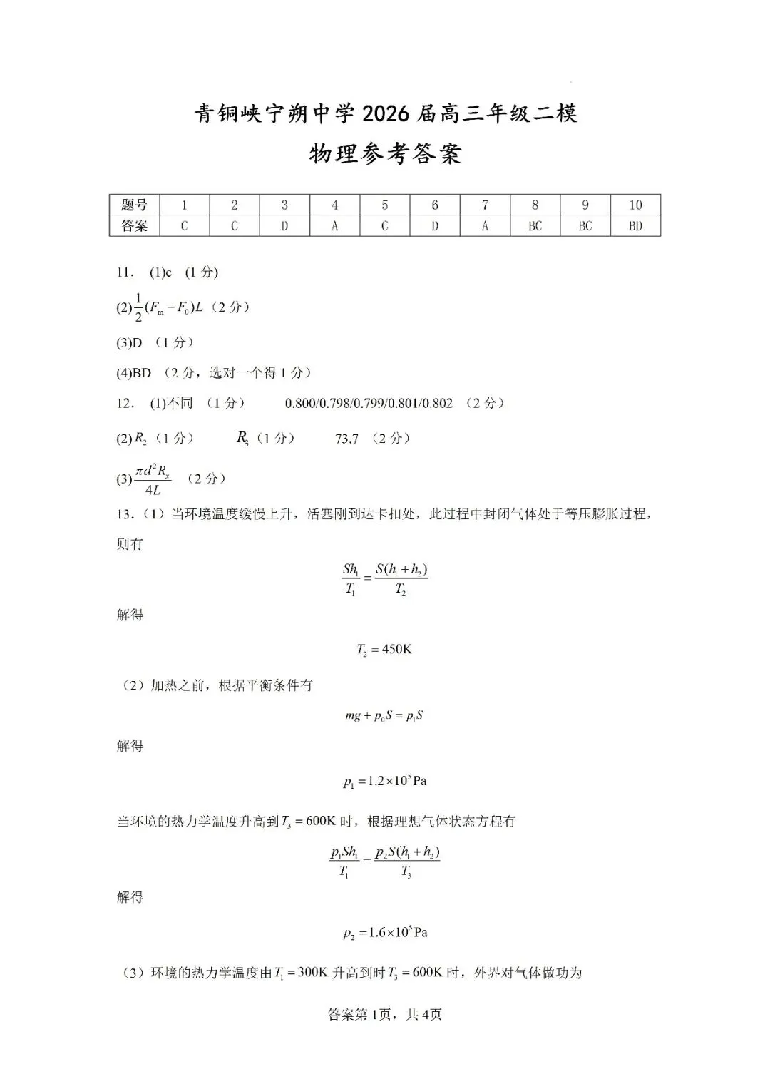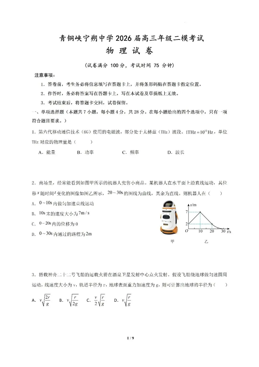 >青铜峡市宁朔中学2026高三物理二模考试卷