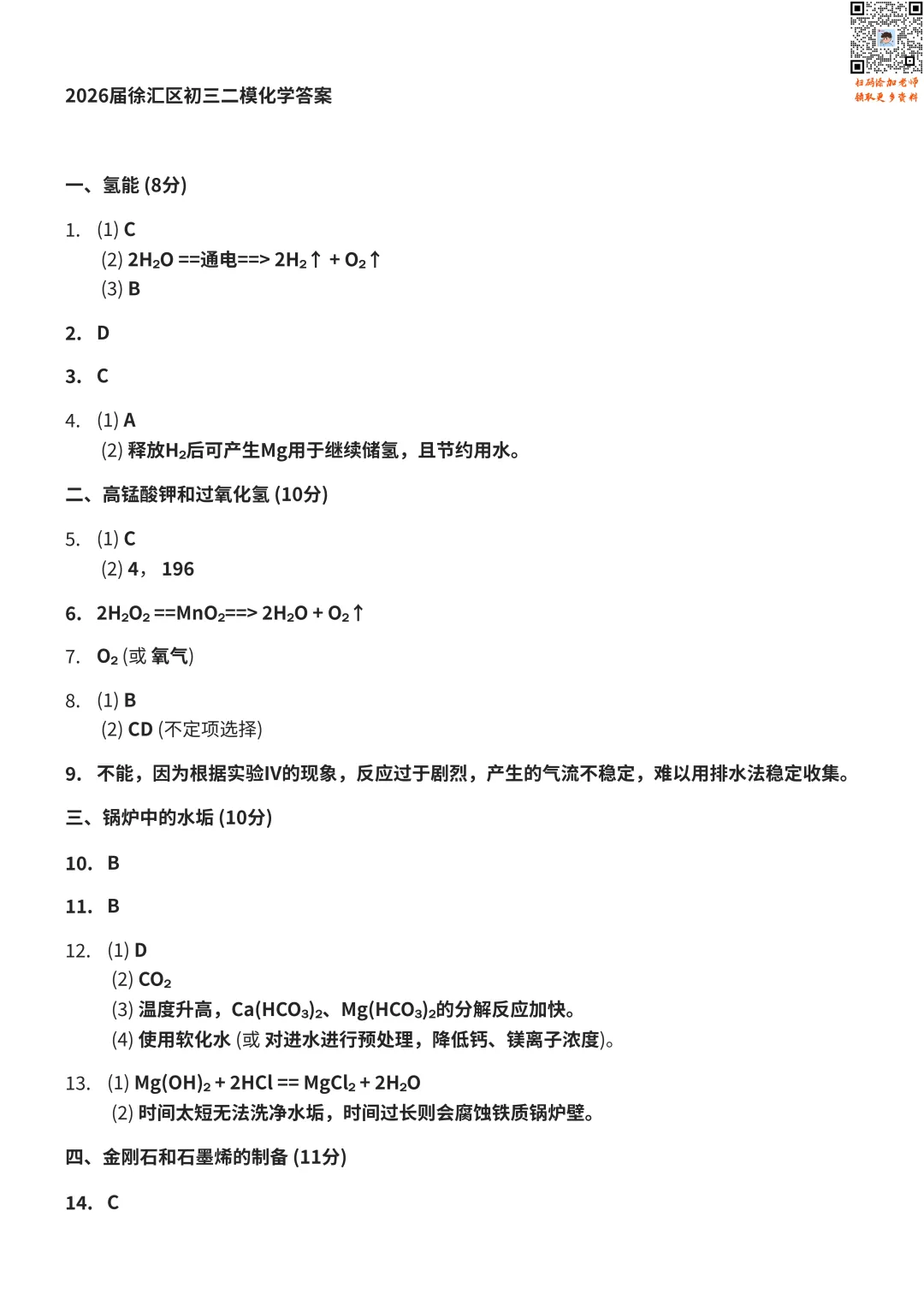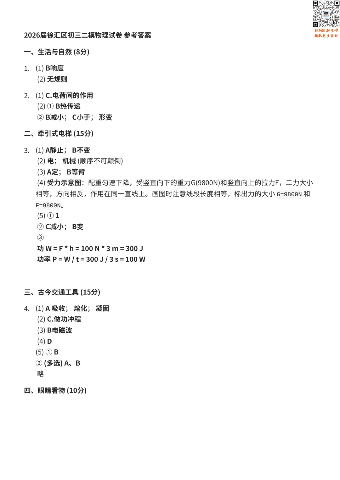 >2026徐汇初三二模物理、化学试卷及答案分享