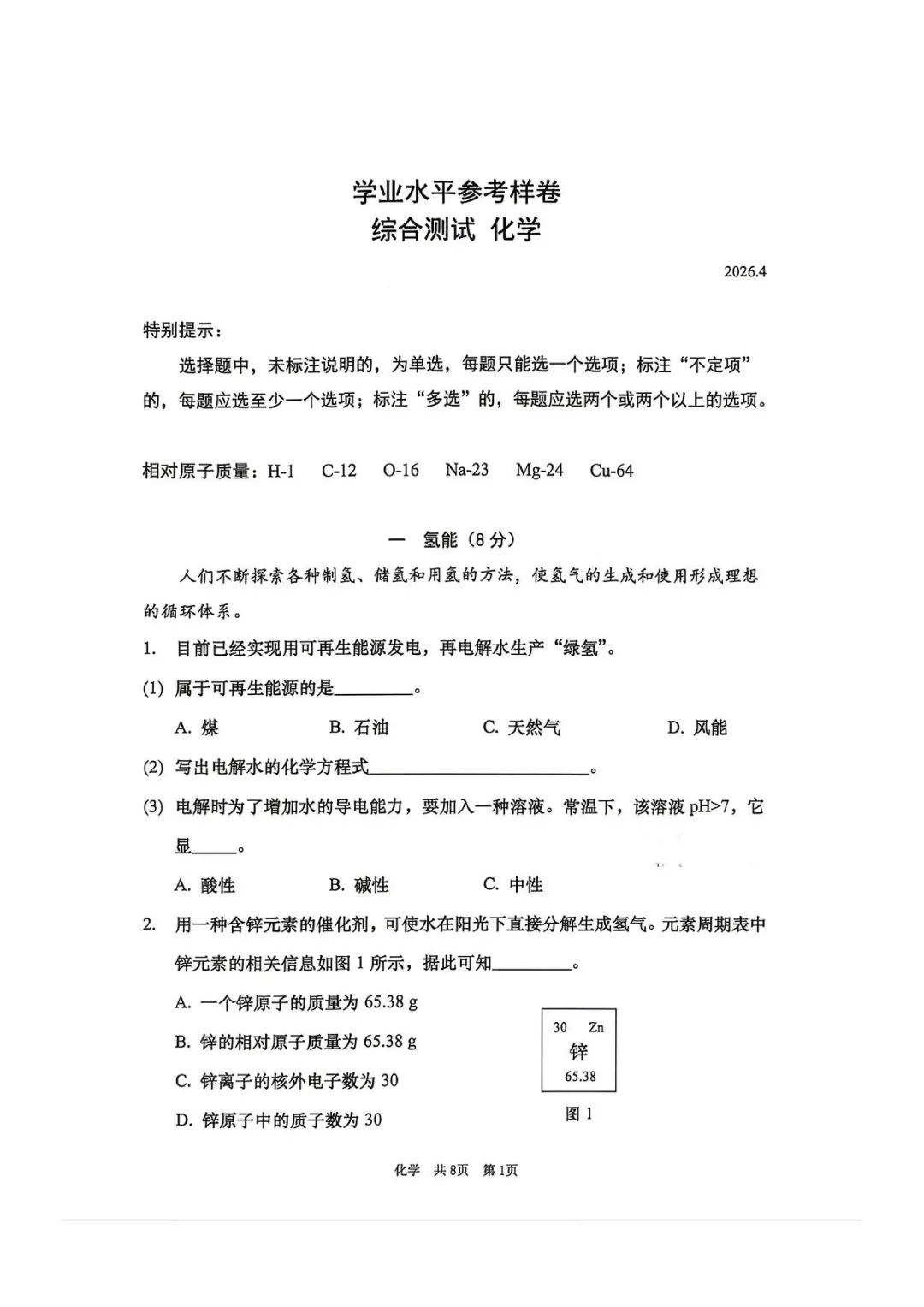 2026徐汇初三二模物理、化学试卷及答案分享