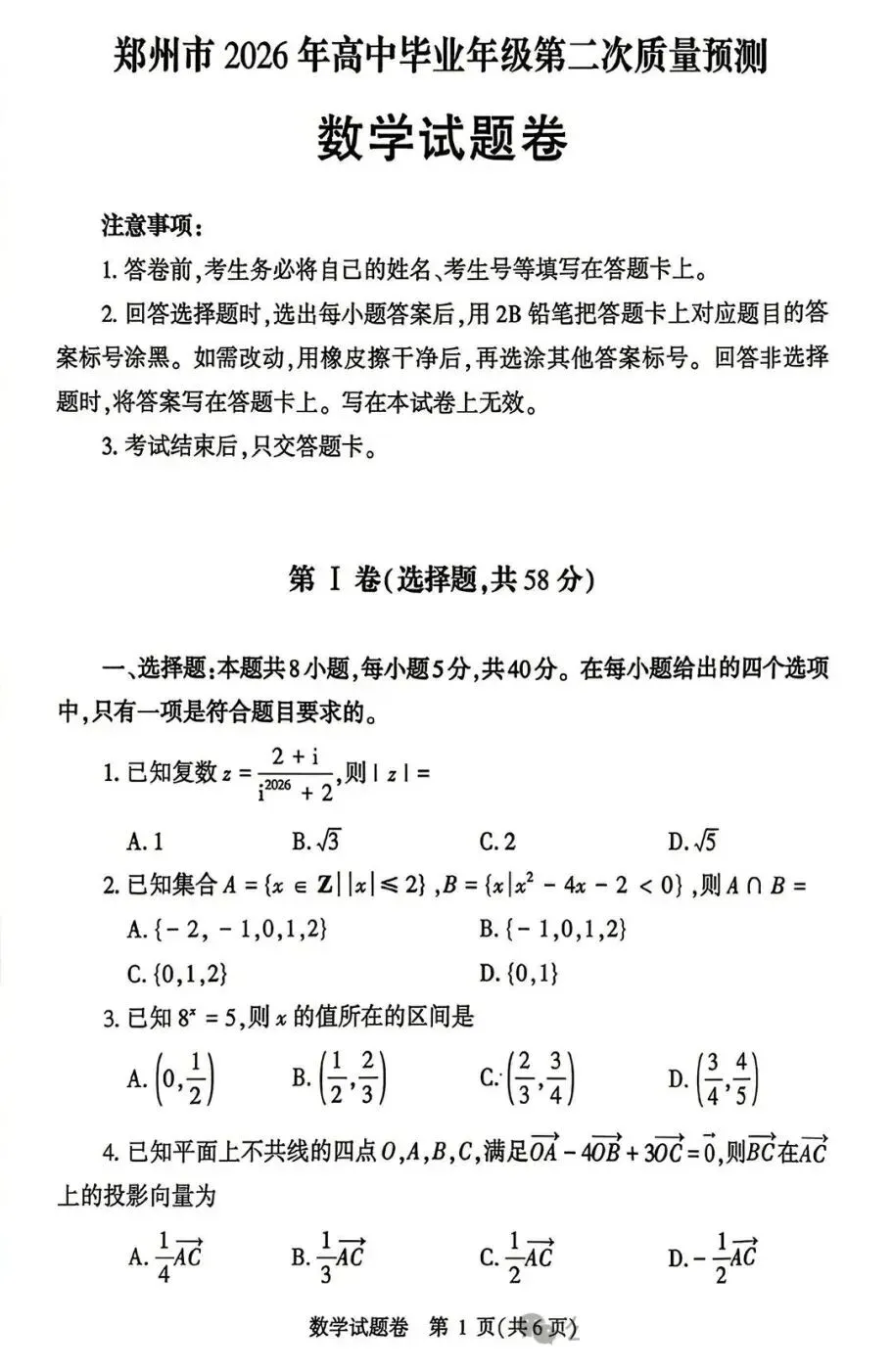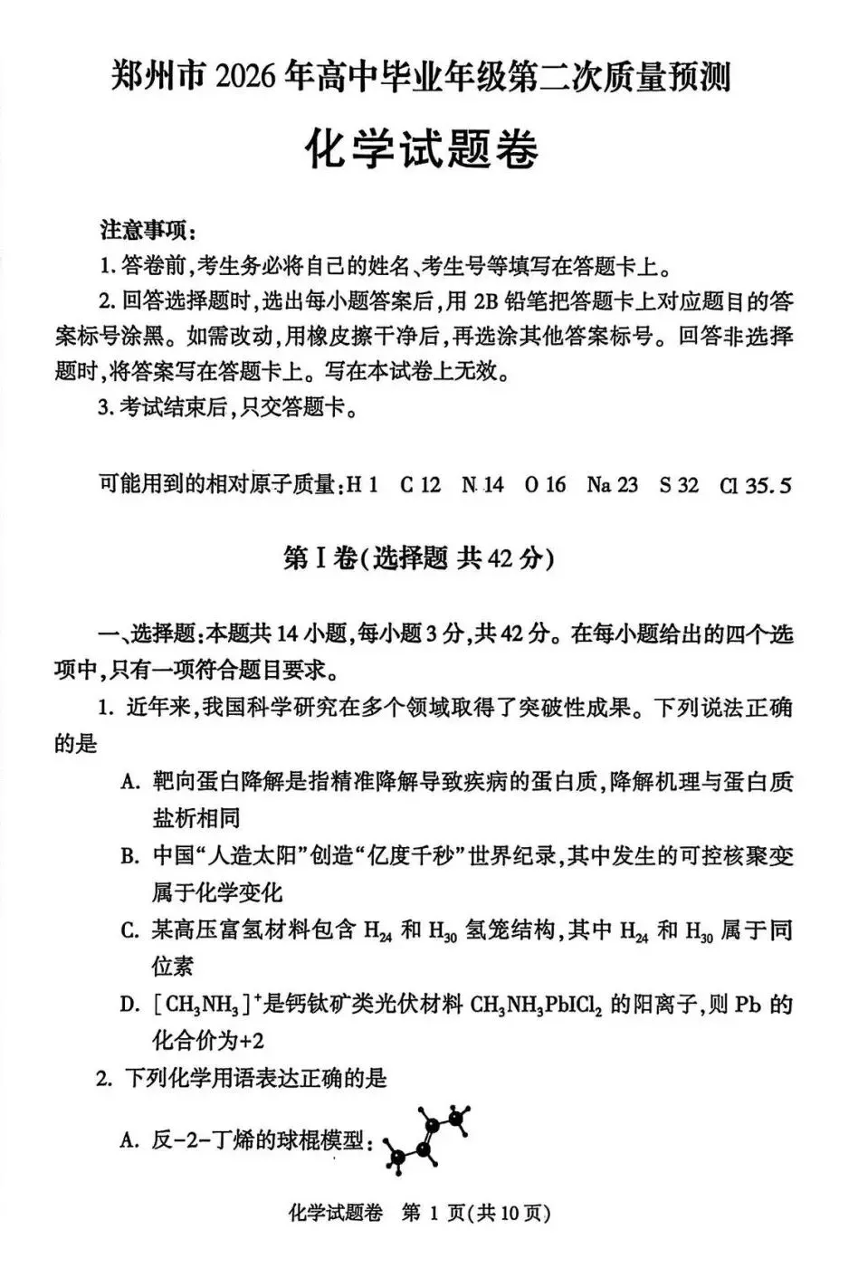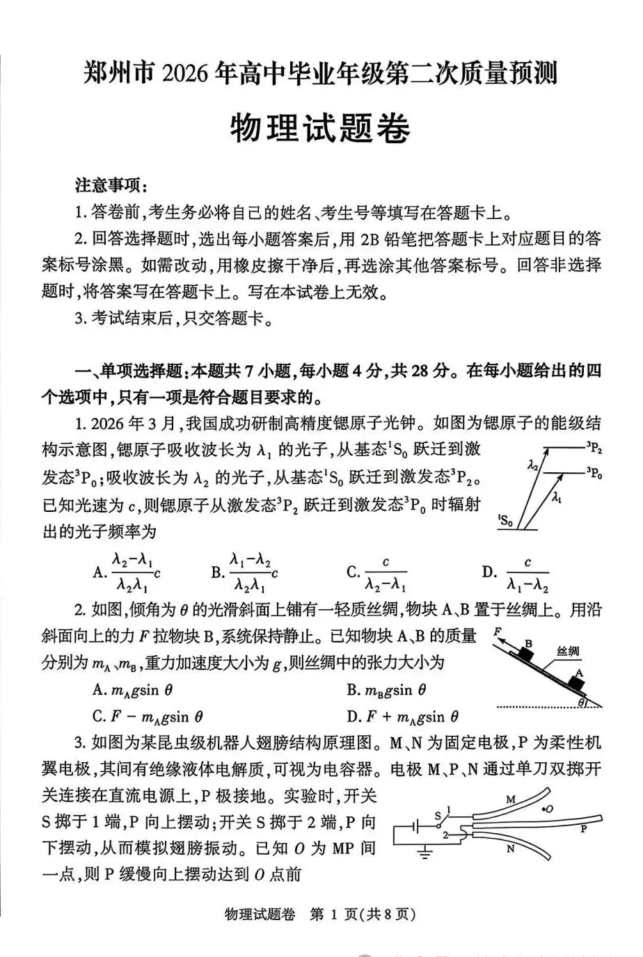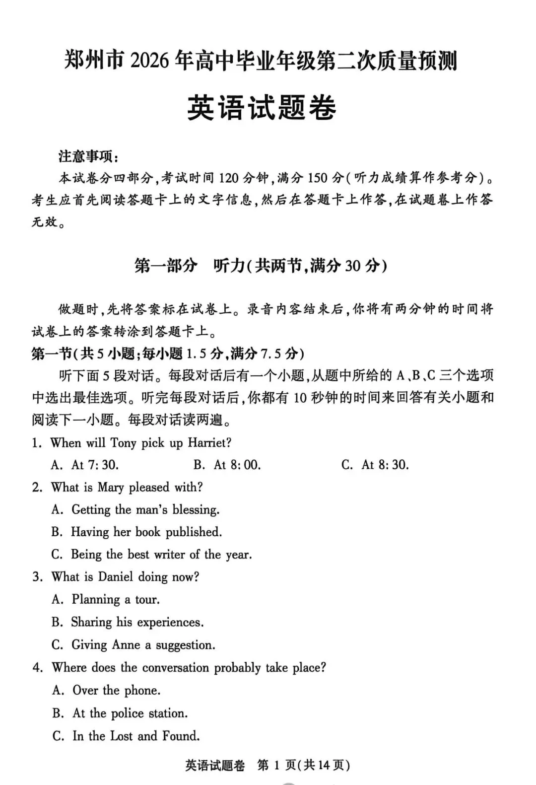 2026郑州高三二模时间是4月20日-22日,已经全部考完,我们整理了全套的试题及答案,高清电子版,家长及考生可以下载打印!